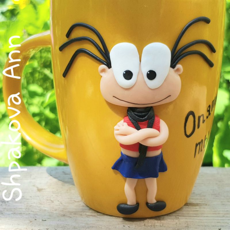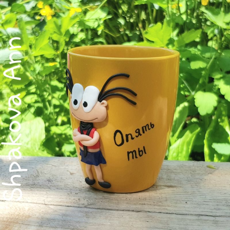 Оригинальный образ оптимистичной хулиганки из полимерной глины на чашке, будет неизменно настраивать вас на нужный лад каждое утро. В дополнение к объемной фигурке идет надпись "Опять ты" из запекаемых красок. Фразу можно сделать другую, по согласованию.