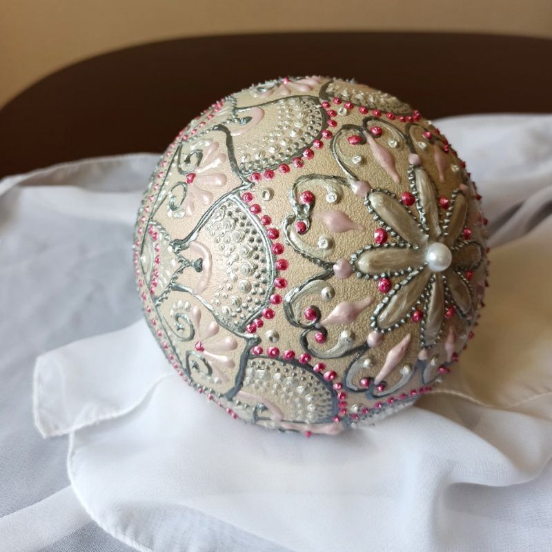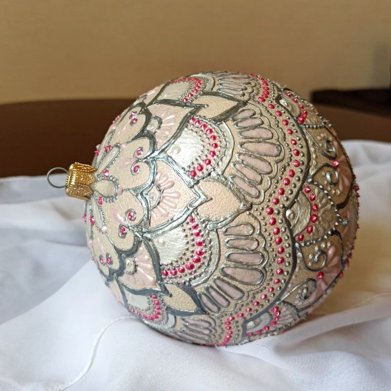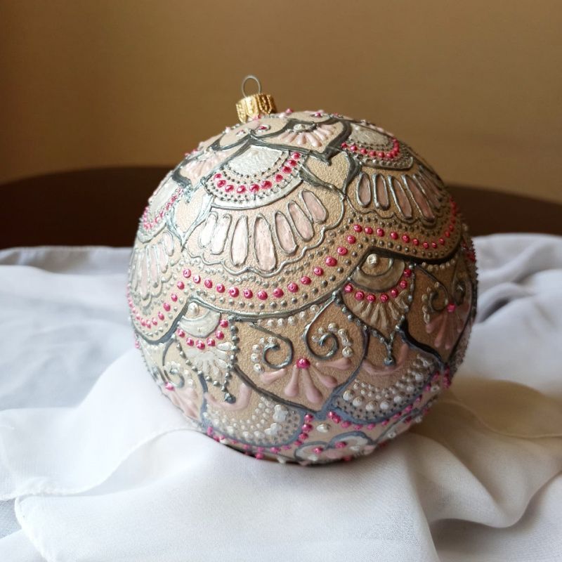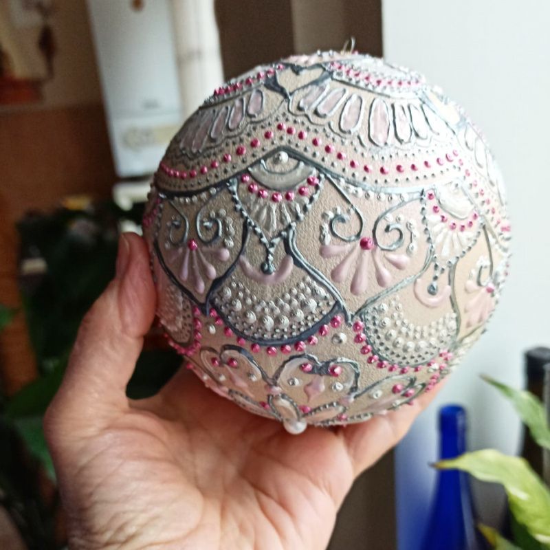 Большой 12 см в диаметре пластиковый шар, роспись акрилом, очень нежный и праздничный,в единственном экземпляре, отличное украшение вашего дома в праздничные дни.