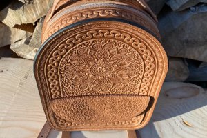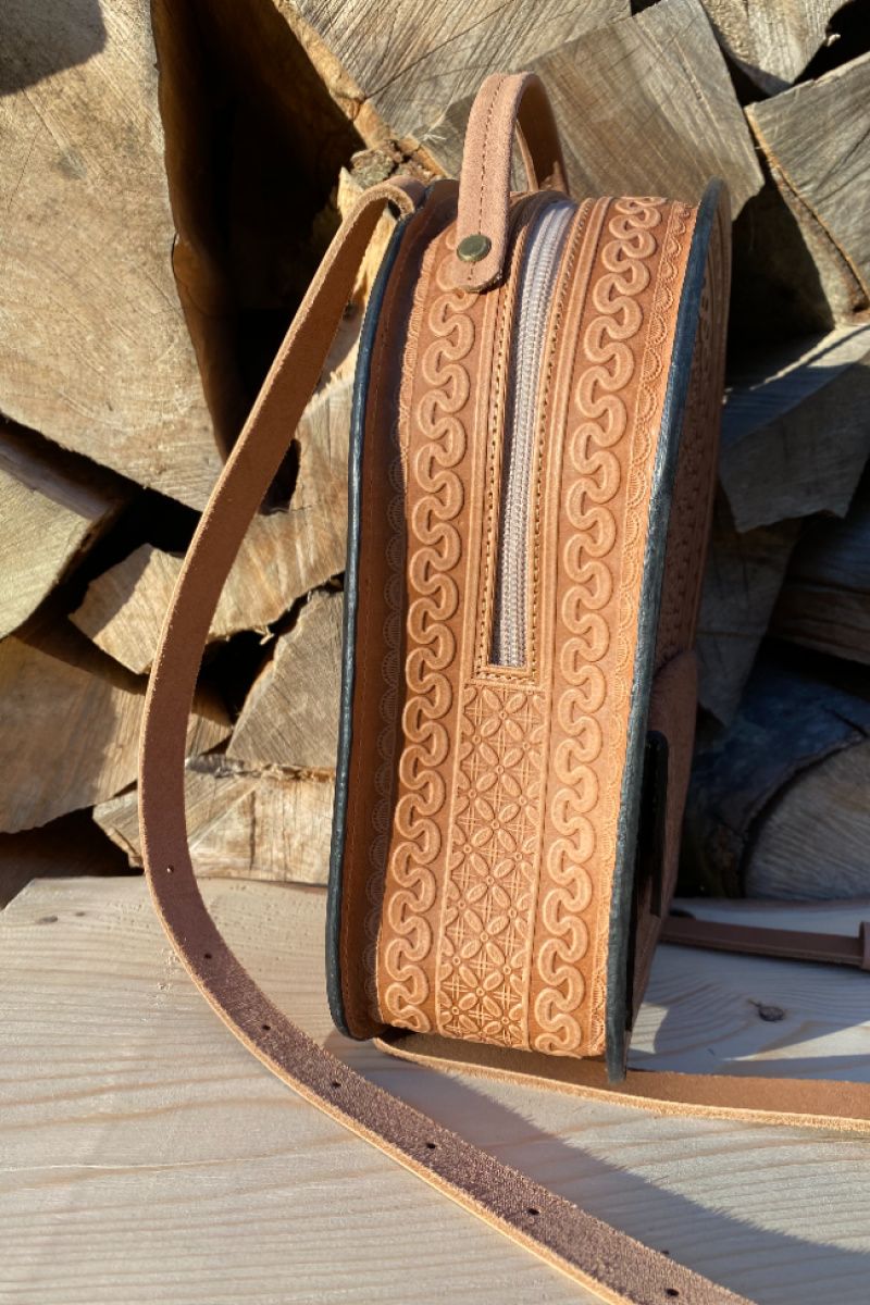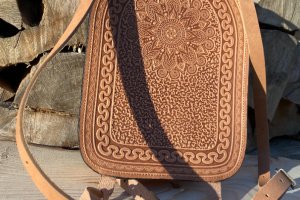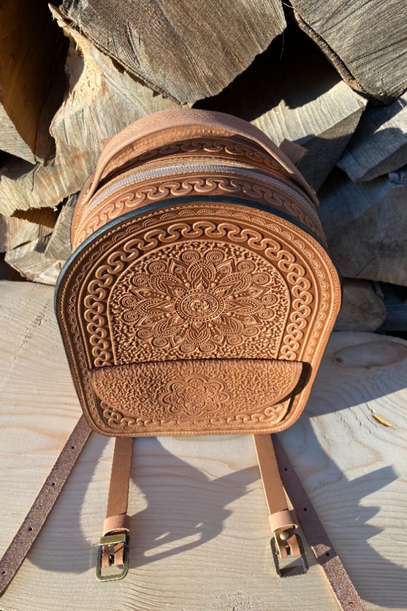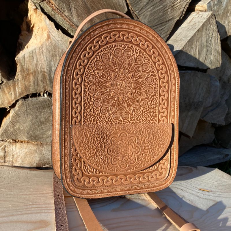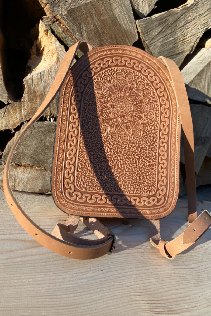 Рюкзак "Талисман" выполнен из натуральной кожи ручной работы. Украшенный узором солнца. Оригинальный и стильный. С верху есть ручка и ремешки, которые регулируются. Внутри одно отделение и один внешний карман на магните. Доступен для заказа в различных цветах!