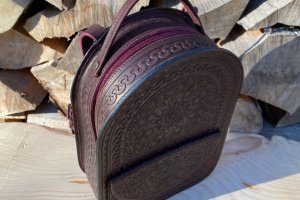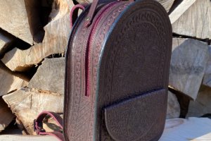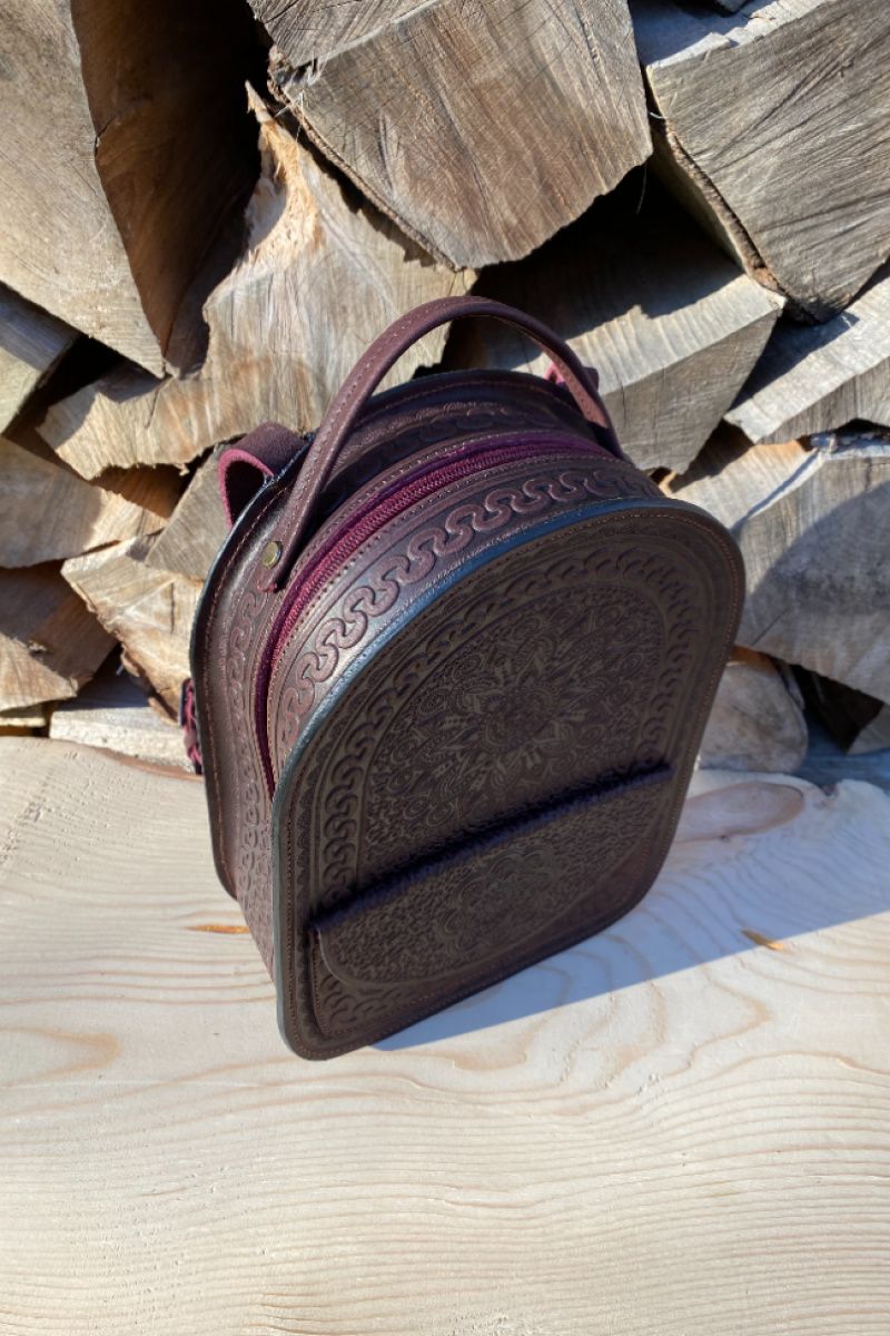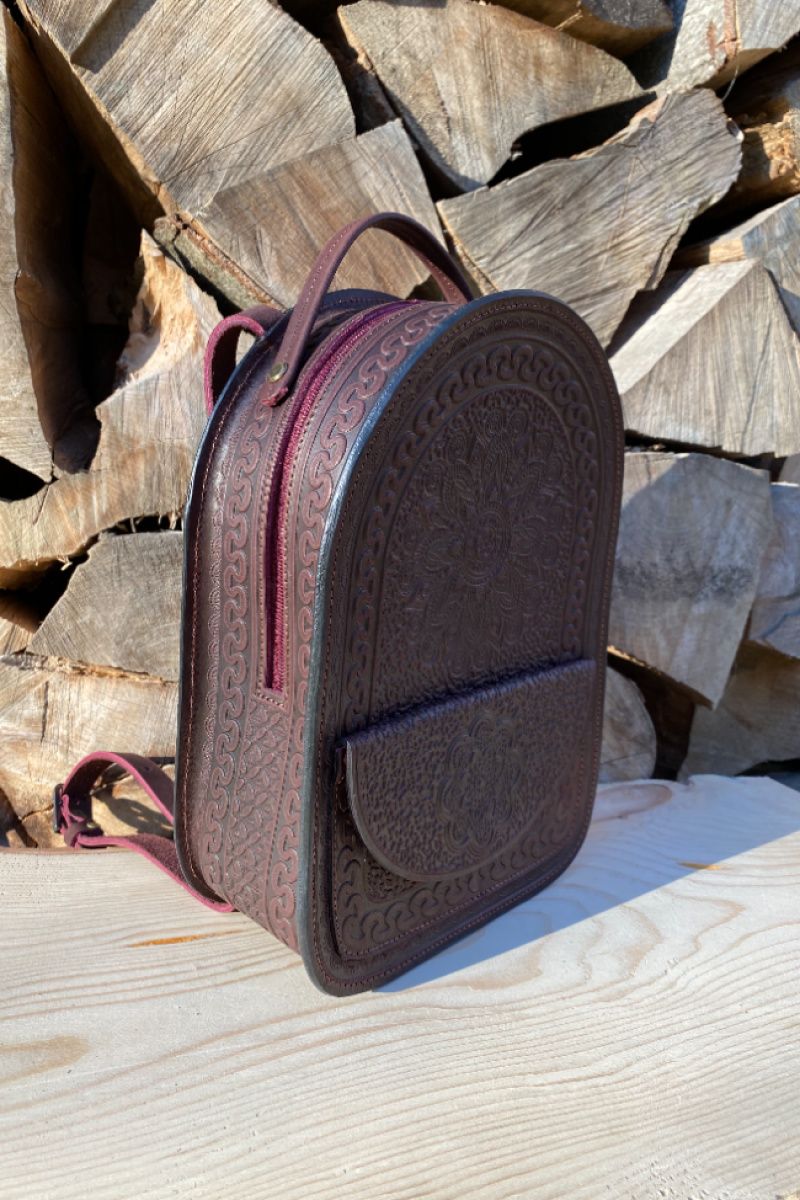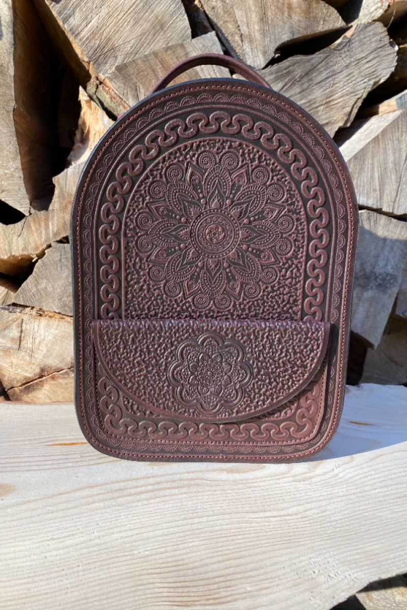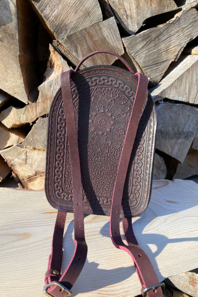 Рюкзак "Талисман" выполнен из натуральной кожи ручной работы. Украшенный узором солнца. Оригинальный и стильный. С верху есть ручка и ремешки, которые регулируются. Внутри одно отделение и один внешний карман на магните. Доступен для заказа в различных цветах!