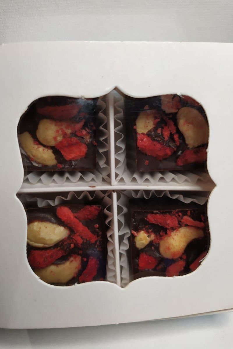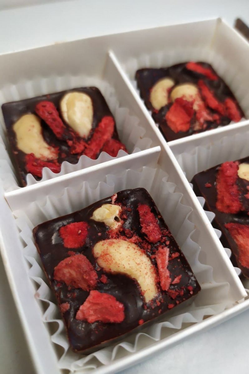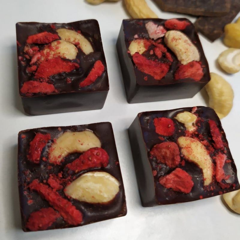 Шоколадные кубики с кешью и сухой клубникой. Полезная сладость без сахара. У нас можно заказать натуральные конфеты с эксклюзивным индивидуальным подходом.
