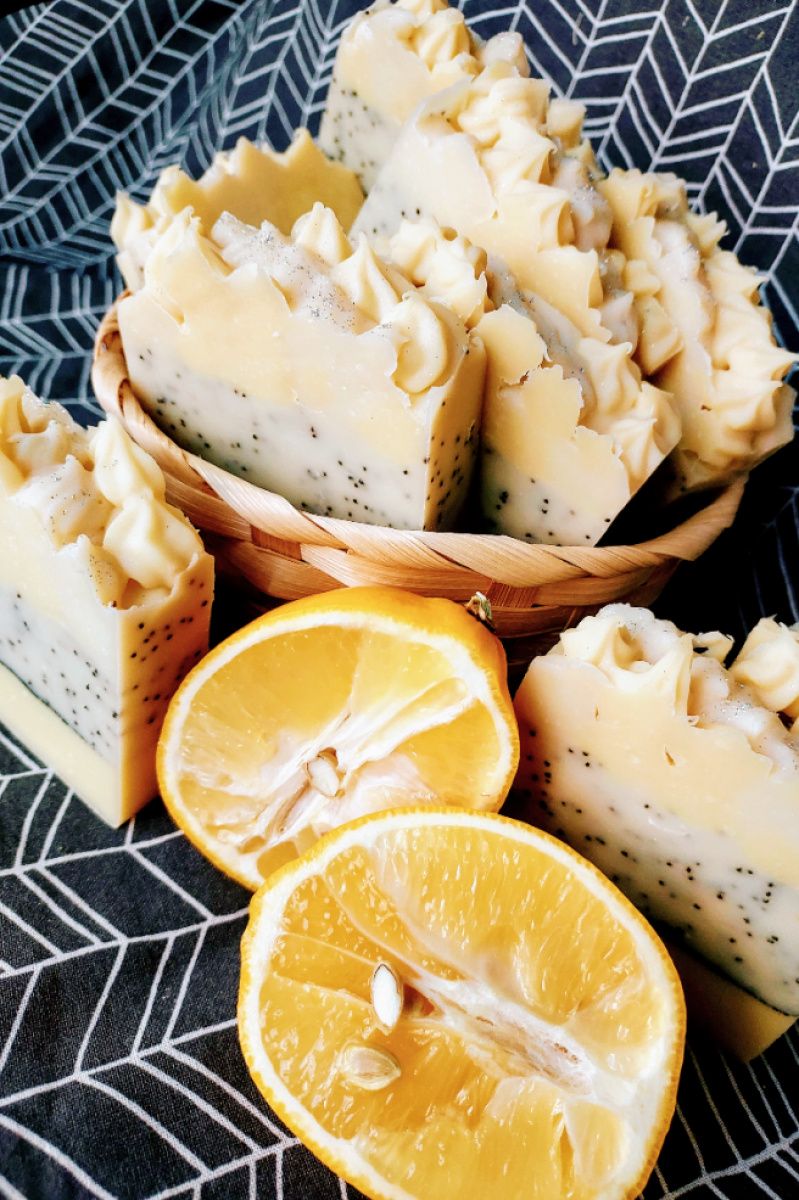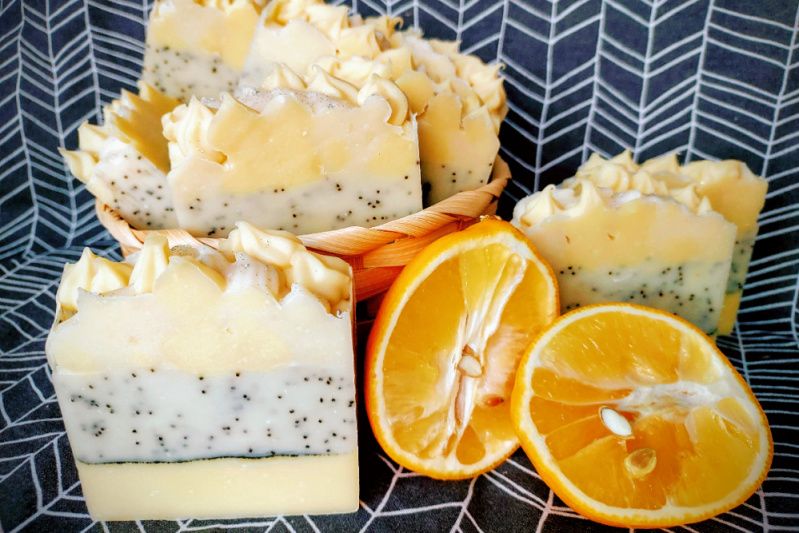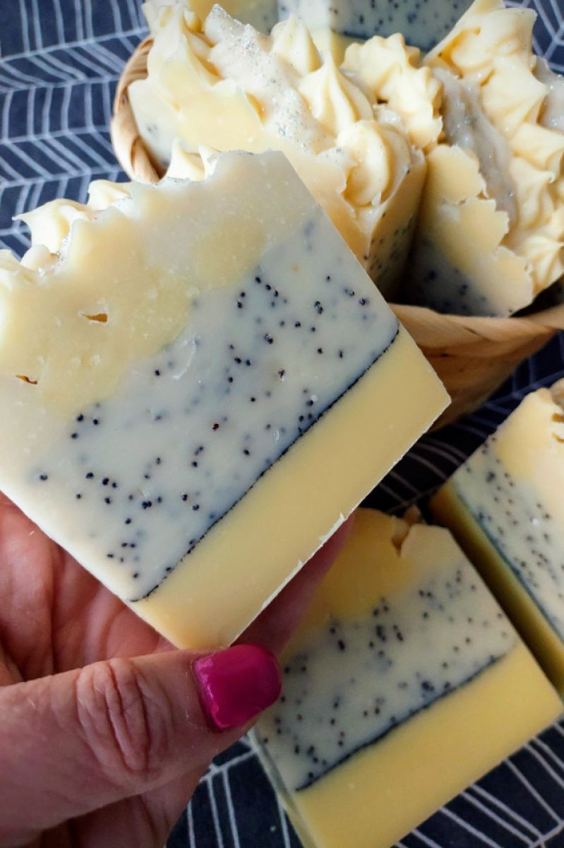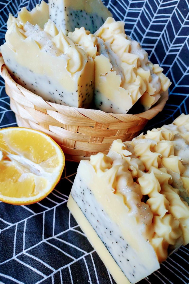 В основе масло Ши, кокосовое, пальмовое, масло абрикосовых косточек, касторовое. Прослойка с эффектом скраба - его роль выполняют маковые зернышки. Пудра лимона оказывает отбеливающий эффект, питает и тонизирует. Вес 90 - 95 гр. PH идеален ).