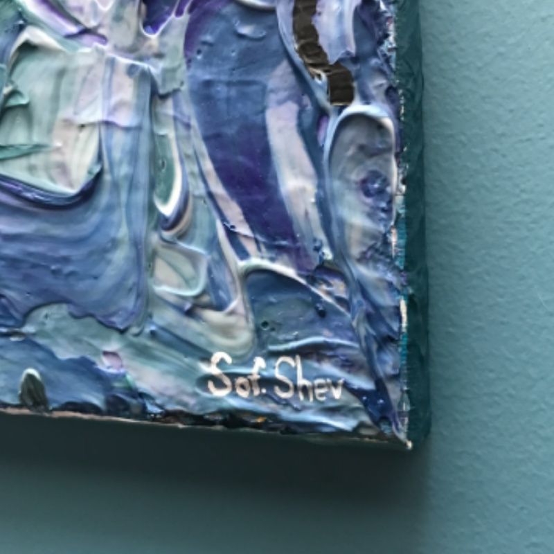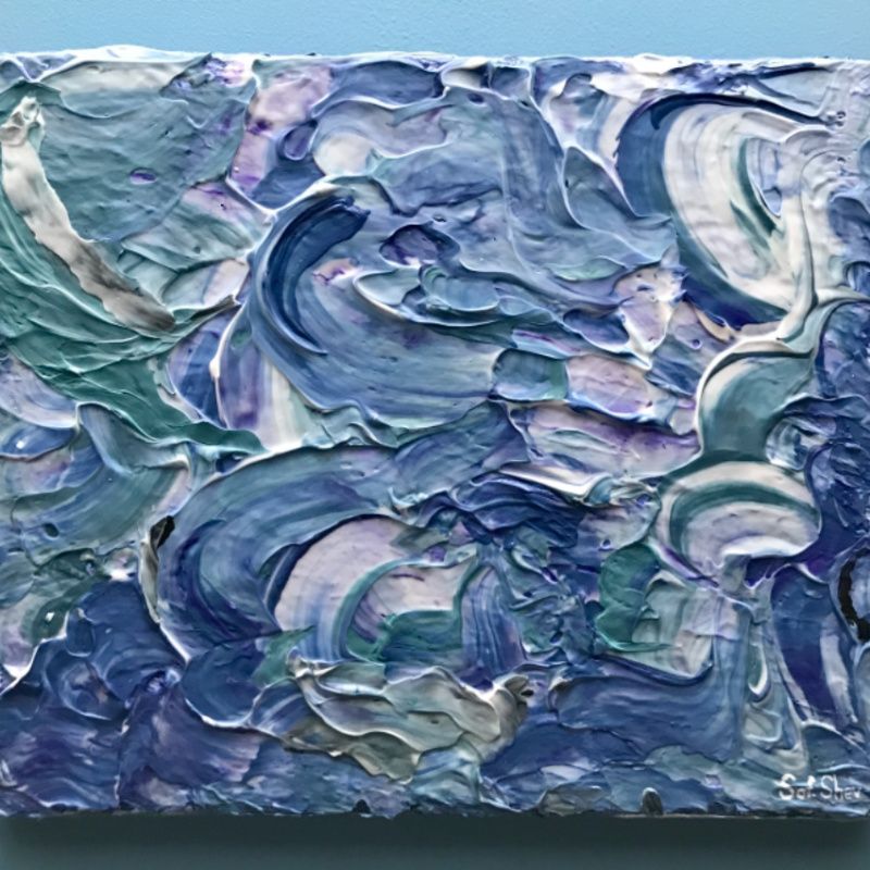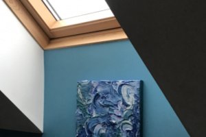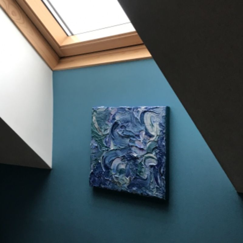 Глубокие синие и голубые оттенки разбавленные классическим белым. Успокаивает и вдохновляет. Всплеск цветов и текстуры на стене.