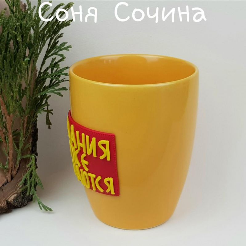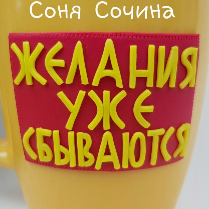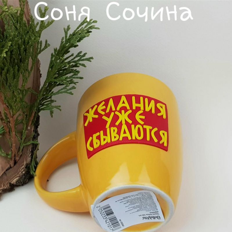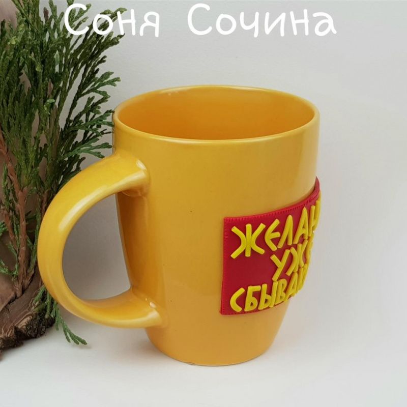 Цветная чашка с жизнеутверждающей надписью "Желания уже сбываются" наполненная успокаивающим чаем, перед каждой медитацией будет наводить на умиротворенные размышления...