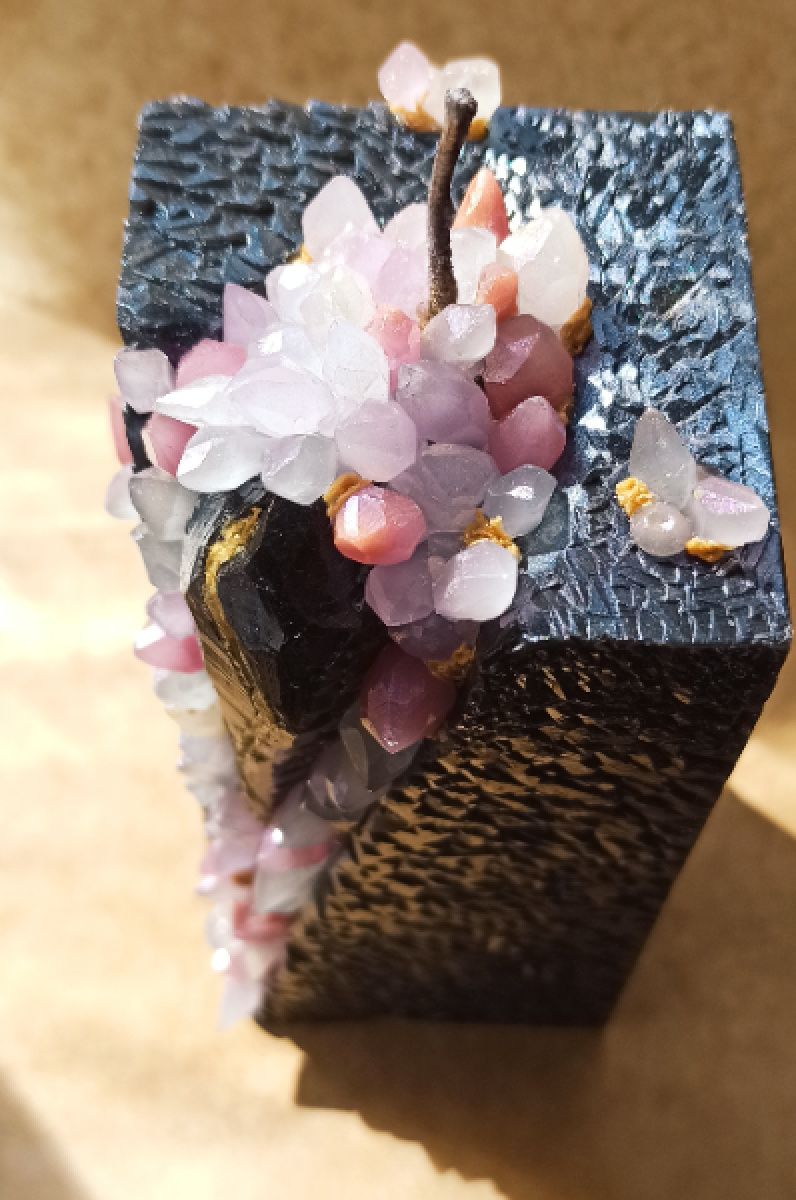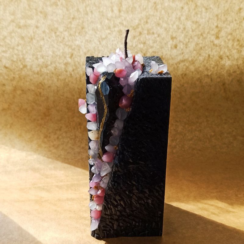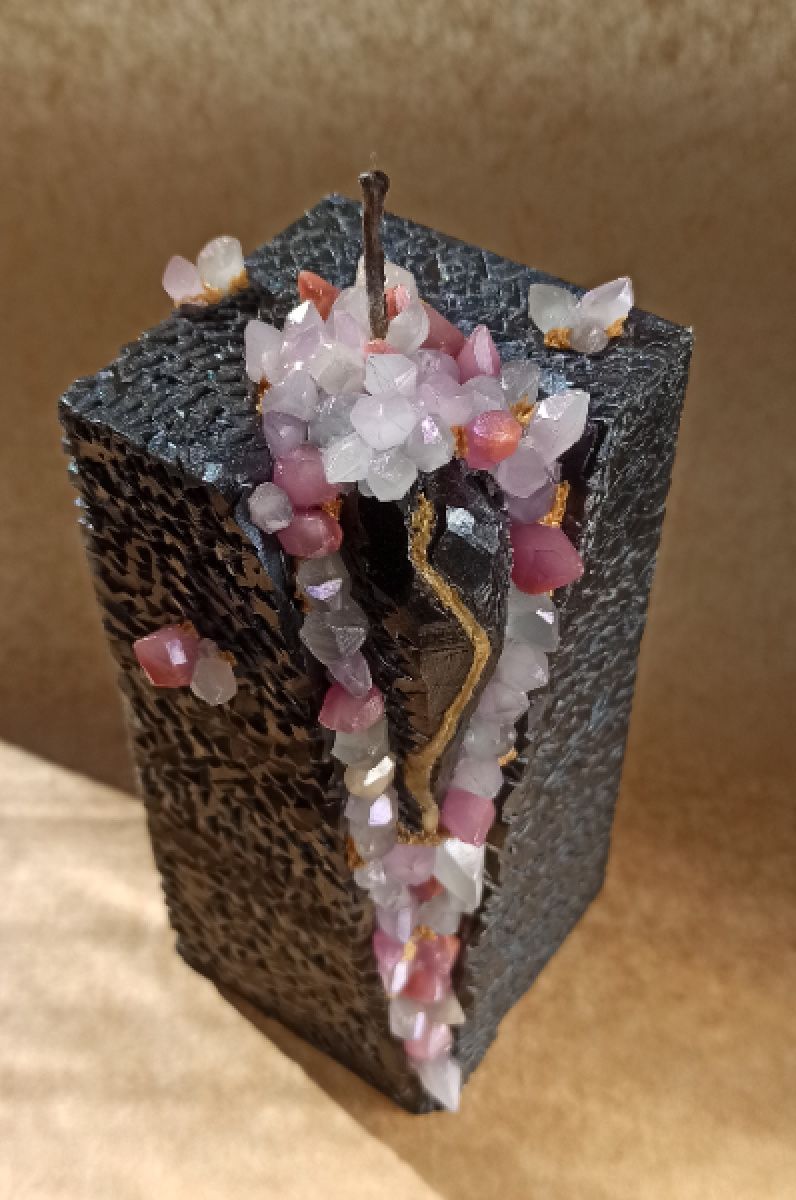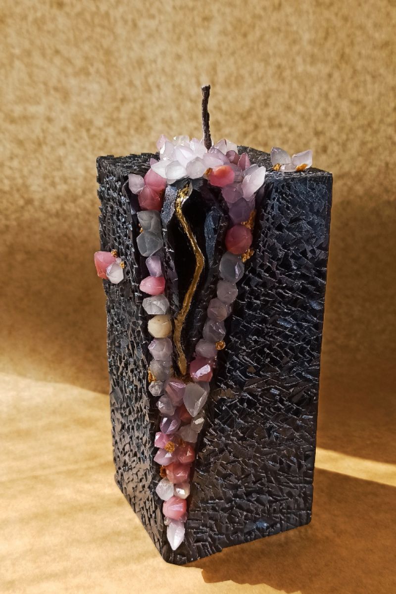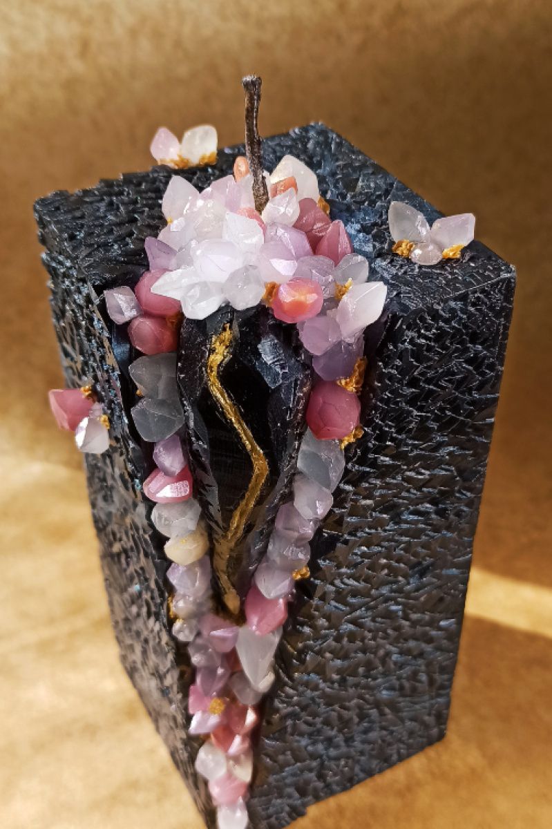 Свеча для тех кто любит драгоценные камни) Такой себе графитовый, грубо отесан камень с кристаллами кварца и золотой прожилкой впереди. Ручная работа до последнего кристаллика. В единственном экземпляре.