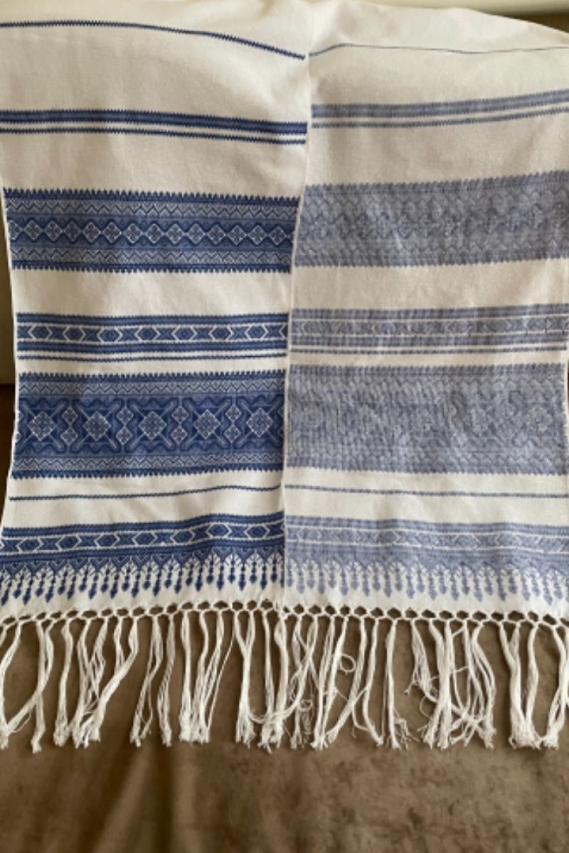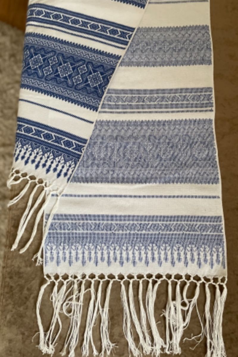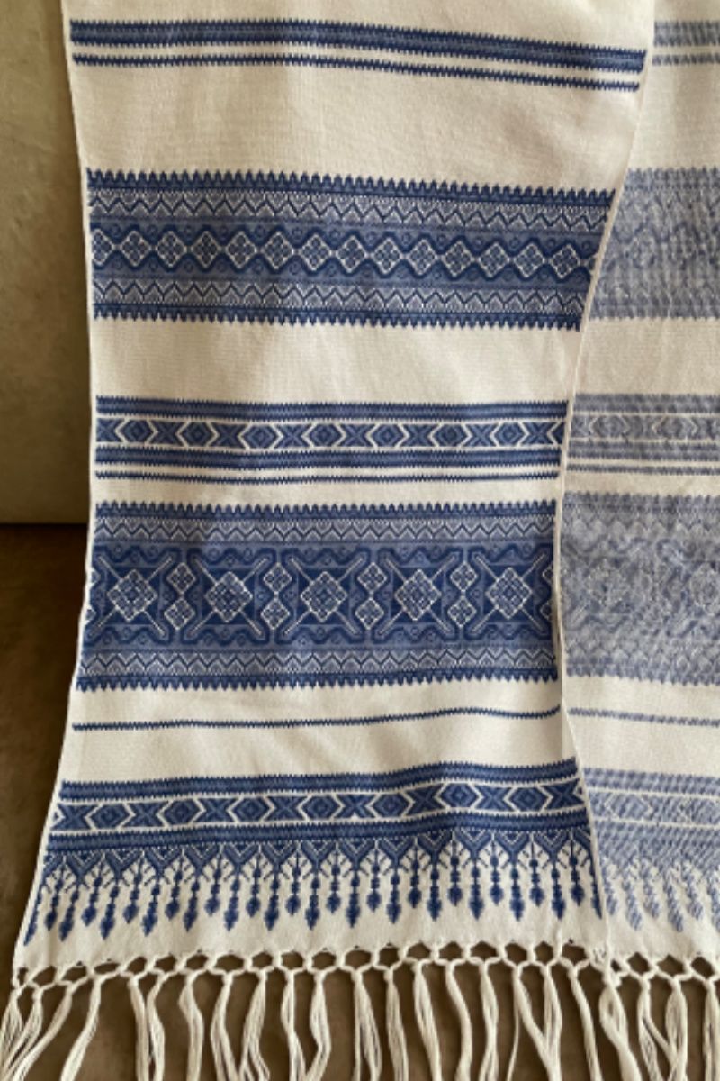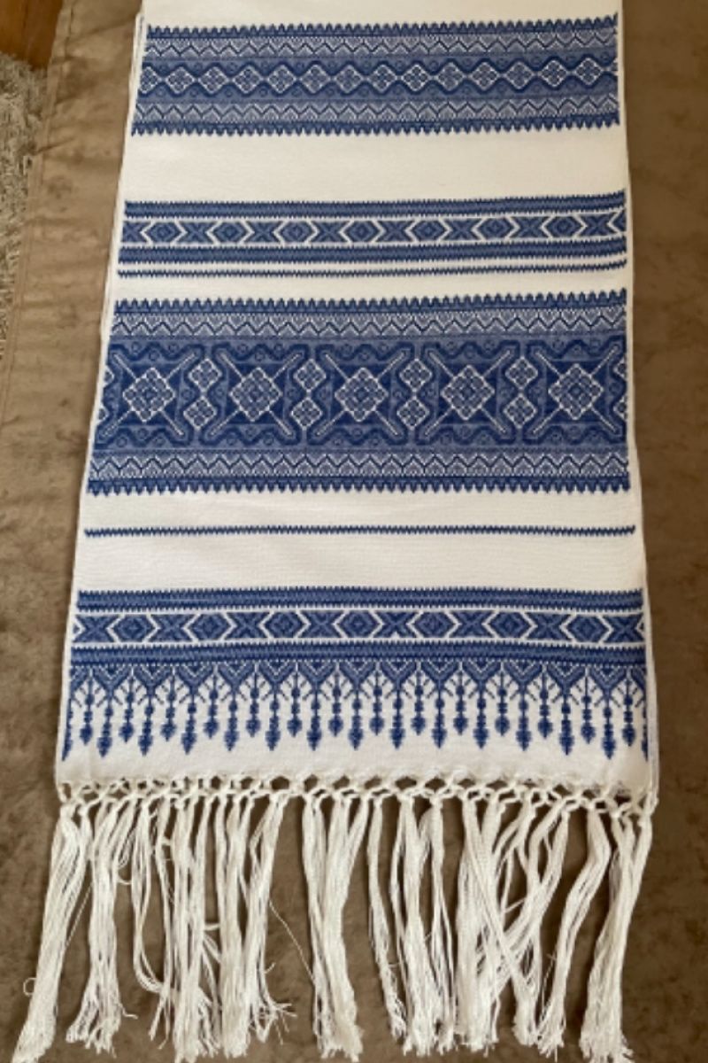 Свадебный рушник с традиционным геометрическим орнаментом. На полотенце с таким орнаментом традиционно ложат каравай для молодоженов .. Он может быть как атрибутом свадебной церемонии так и прекрасным подарком для жениха и невесты. Обратная сторона полотенца без всякого видимого узелка, так же хорош как и передний. Неповторимый нежно-синий полотенце поражает своей оригинальностью.