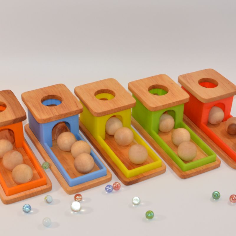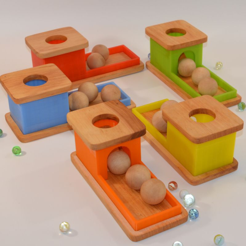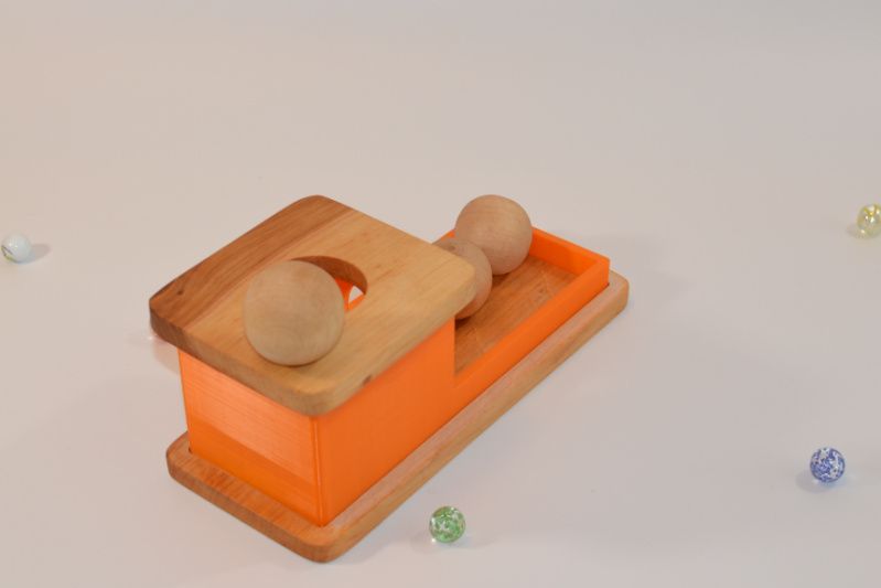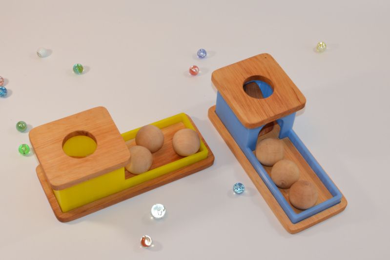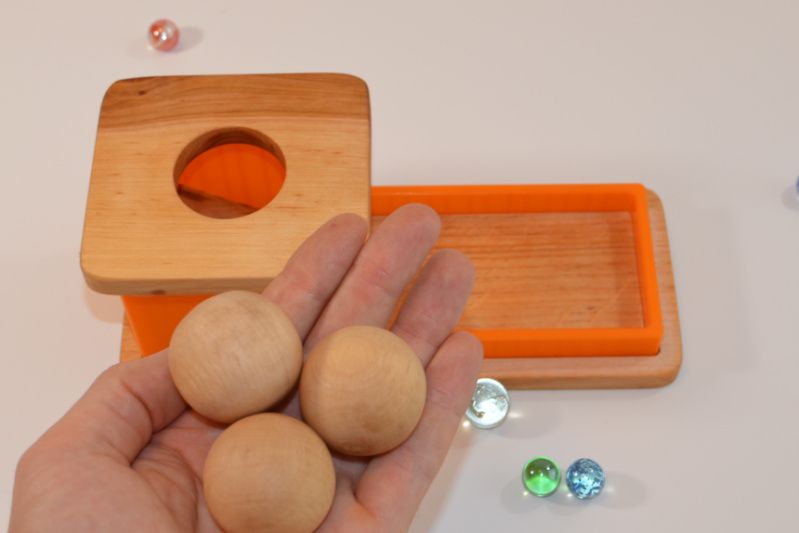 Яркая коробочка с отверстием привлекает внимание детей. Им понравится опускать шарик в отверстие и наблюдать как он выкатывается из коробки.
