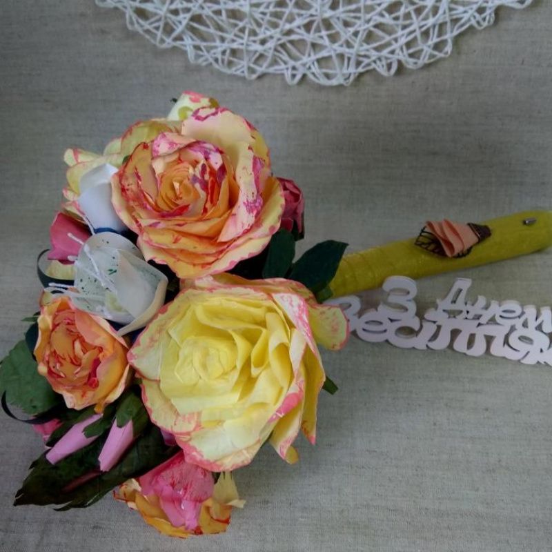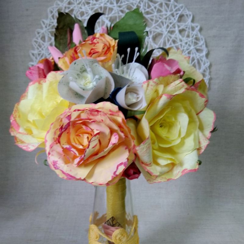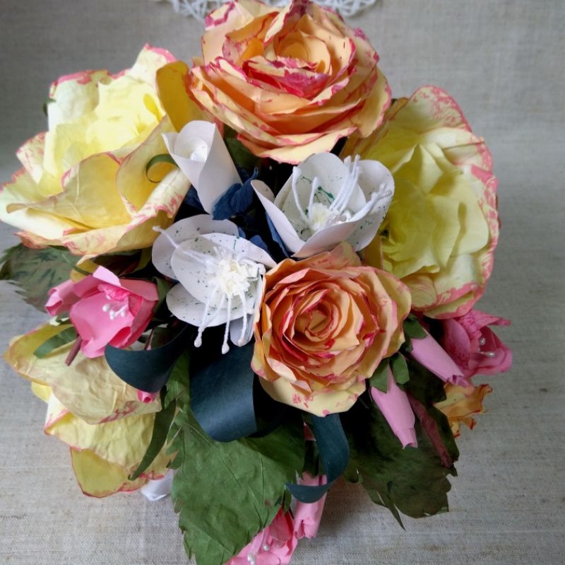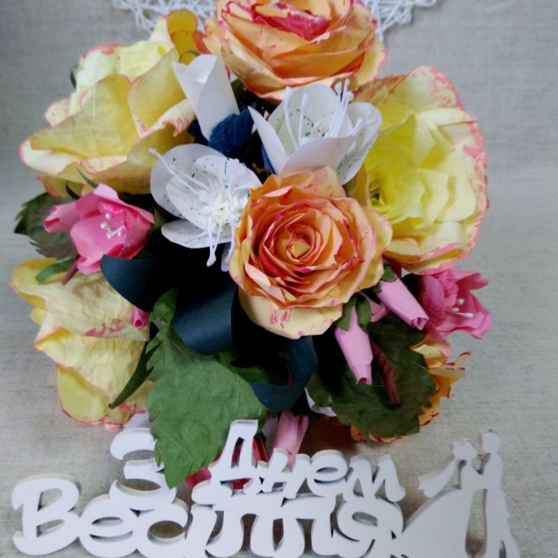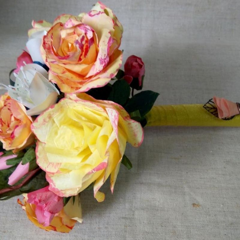 Букет для невесты. Изготовлен из дизайнерской бумаги, стебли задекорированные органзой и декоративной булавкой. Может быть как основной букет и как букет-дублер.