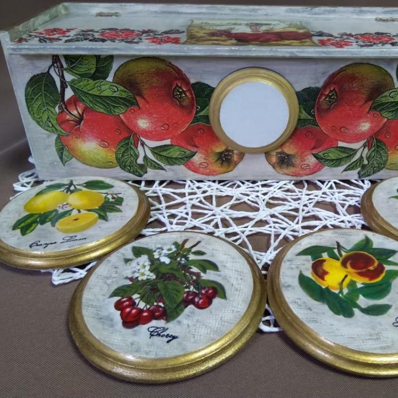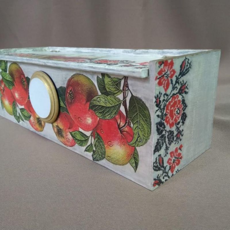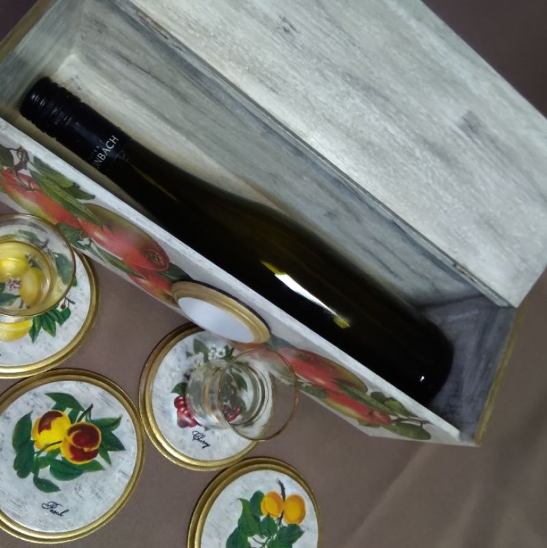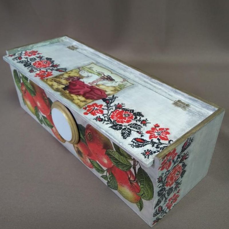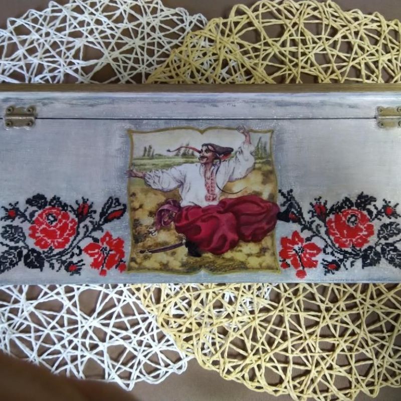 Короб деревяный для спиртного с 4 костерами. Авторское оформление в украинском стиле способом декупажа. На шильде оставлено белое поле для нанесения инициал особы или лого компании. Яркая етно упаковка для подарочного алкоголя.