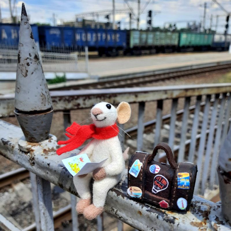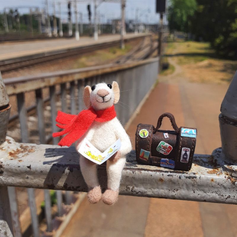Интерьерная игрушка Мышонок путешественник. Мышонок свалянный из натуральной шерсти меринос методом сухого валяния. В кавычках держит карту и при себе имеет чемодан путешественника с наклейками. Высота 9.5 см.