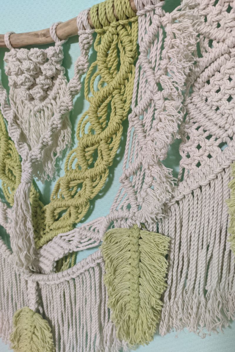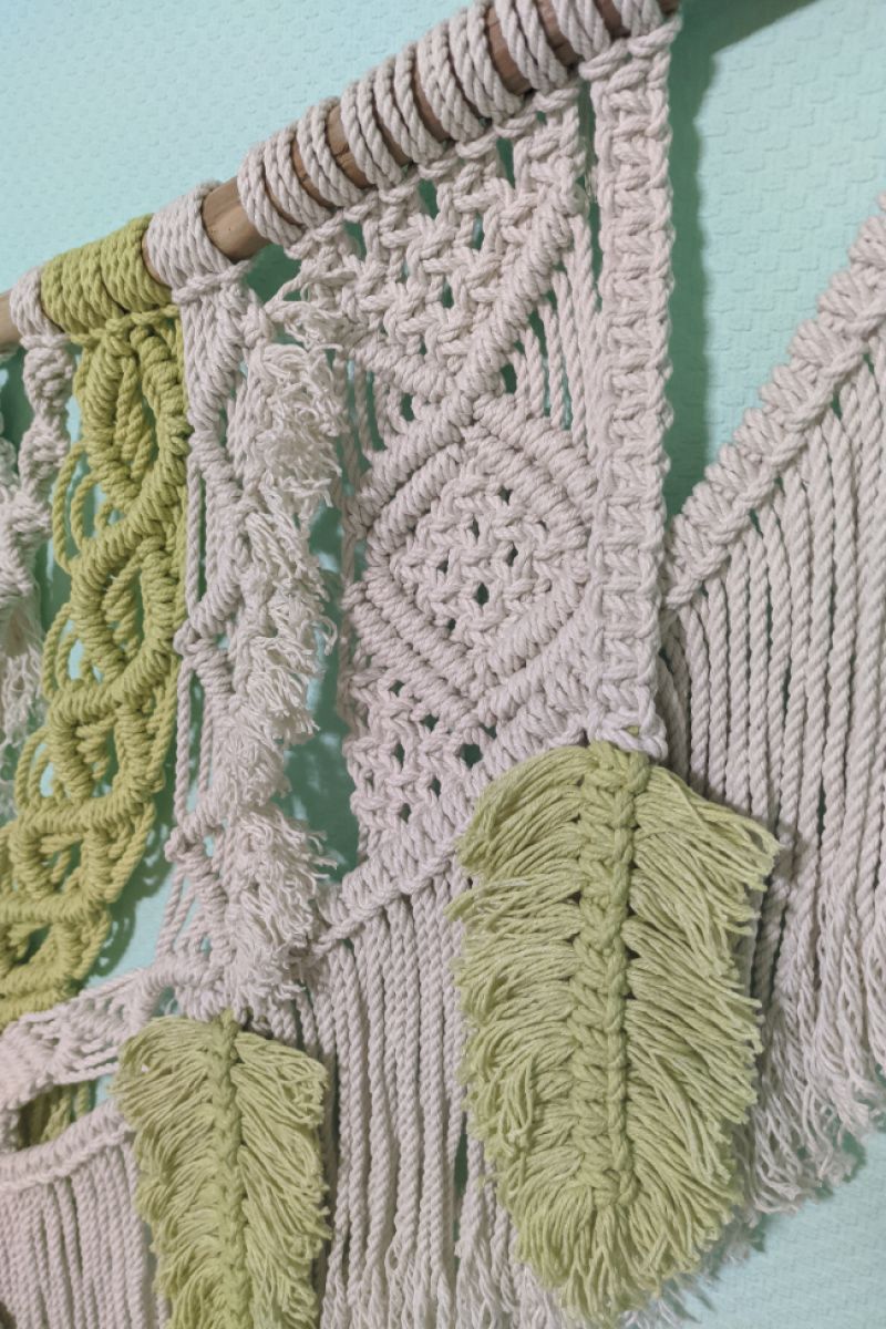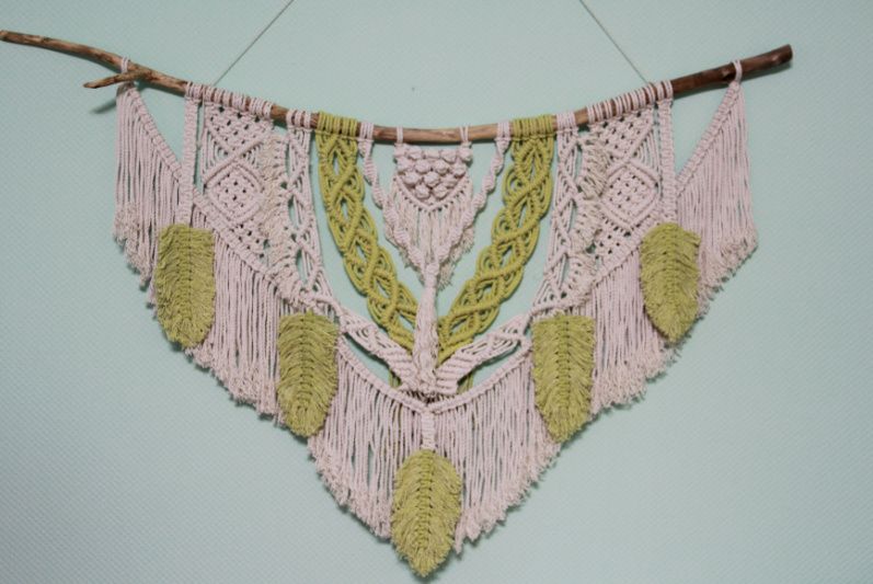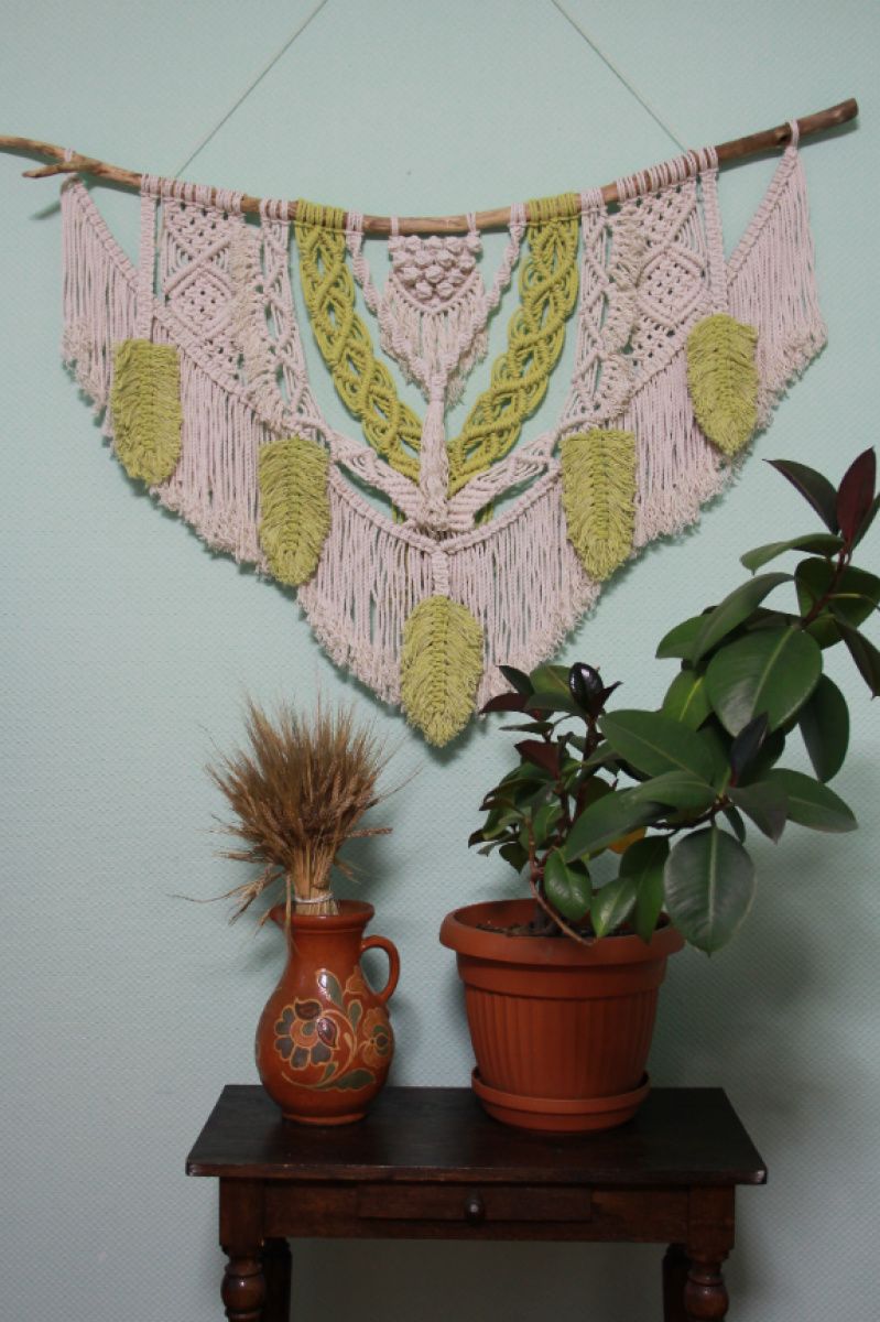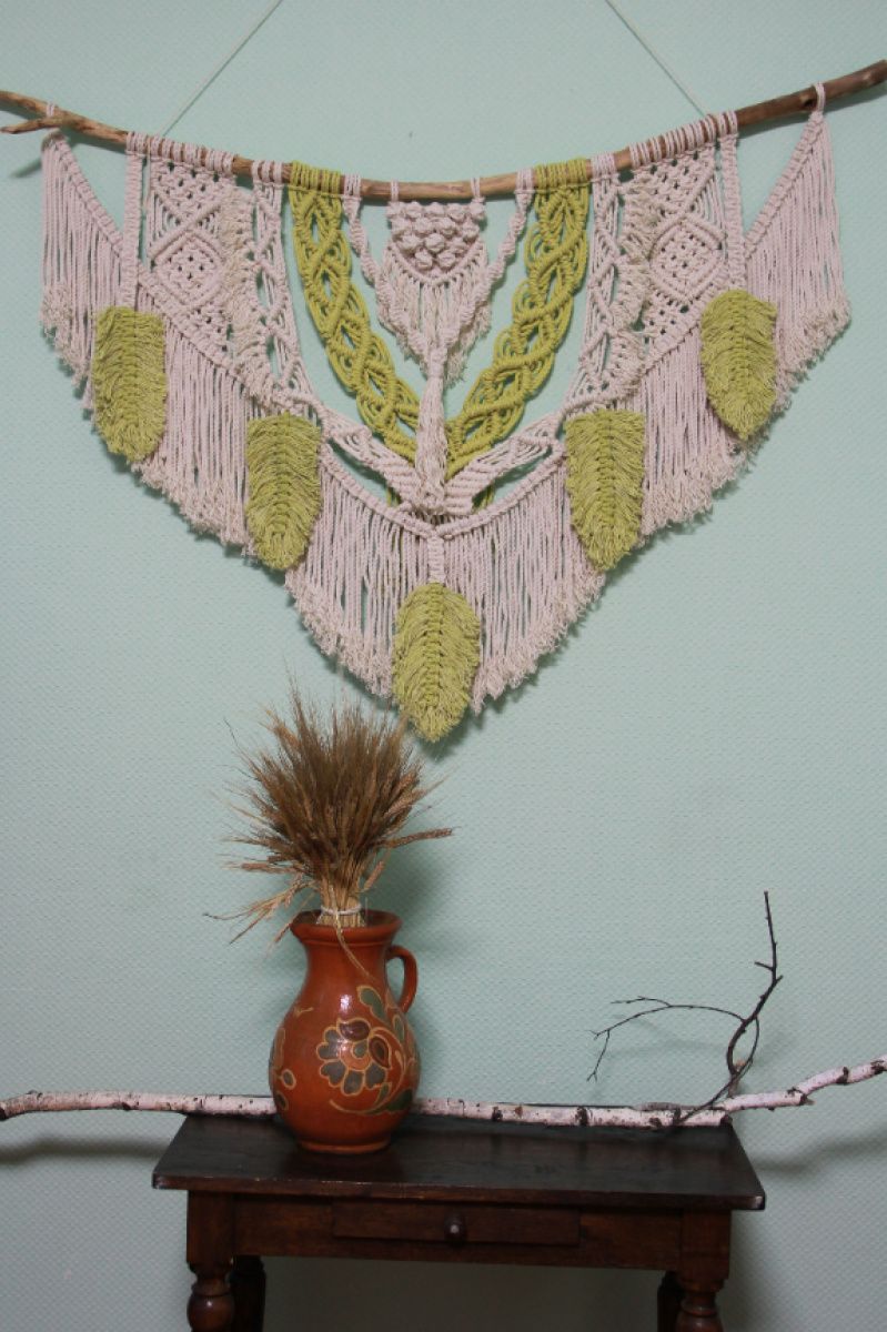 Панно в стиле макраме с оливковыми элементами, будет ярким декором в вашем доме, создаст приятное настроение и незабываемую атмосферу. Удивите гостей своим ощущением стиля. Размер: длина палки 125см, длина изделия 100см, высота изделия от палки 70см. Панно налицо.