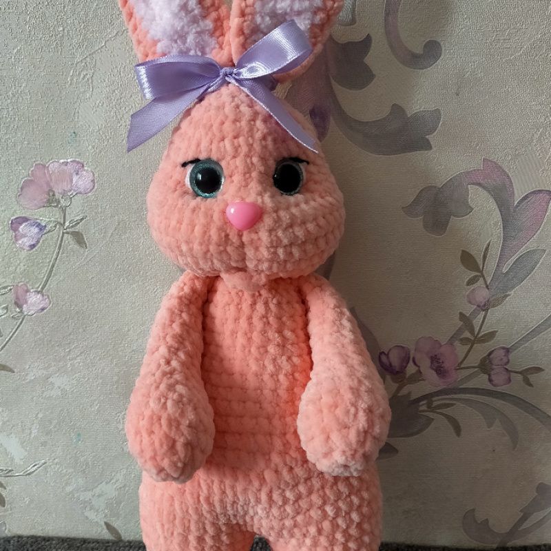 Зайка виготовлена з гіпоалергенної плюшевої пряжі, наповнювач холофайбер. Можливе виконання в інших кольорах
