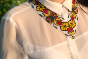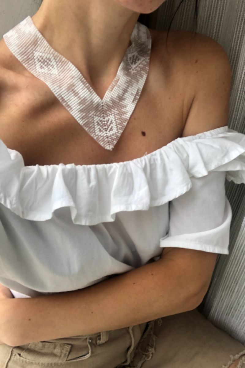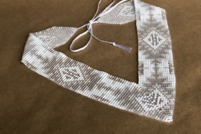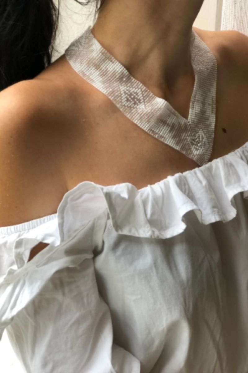 Очень нежный угловой гердан в прозрачно-белом тоне. Выполнен из чешского бисера на прочной нити. Длина одной стороны к внутреннему угла 20,5 см Ширина плетенки 3,8 см