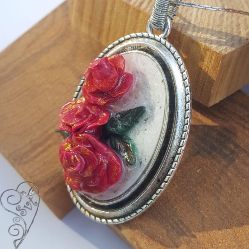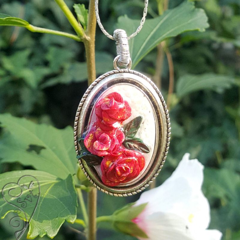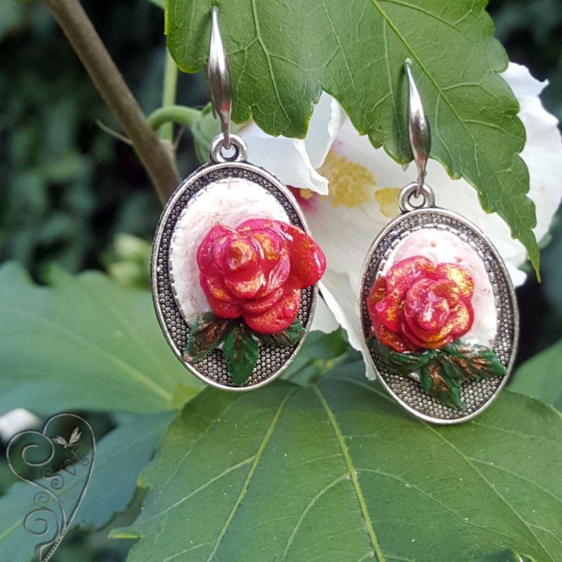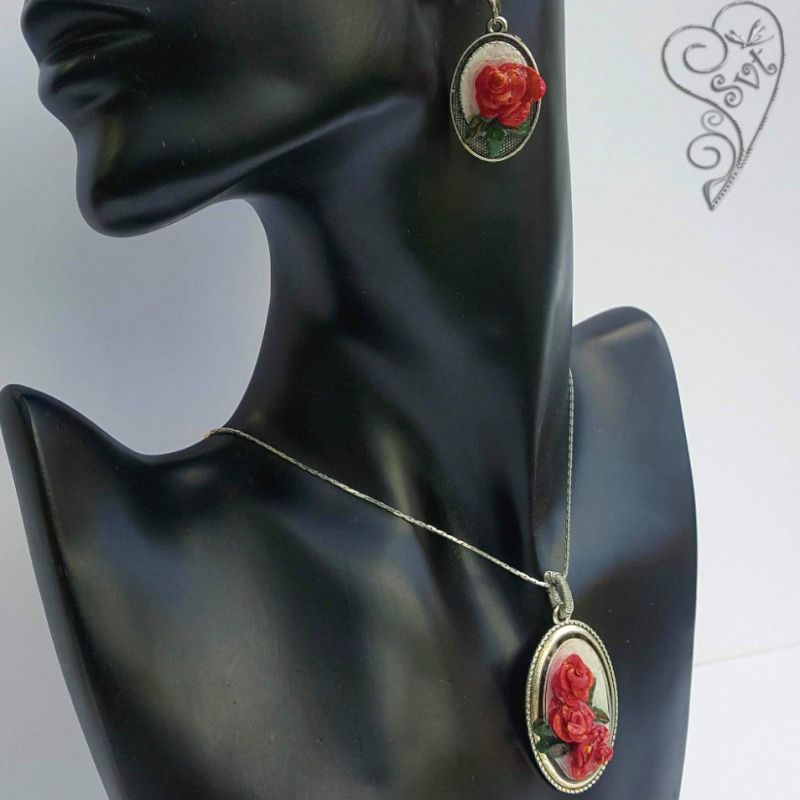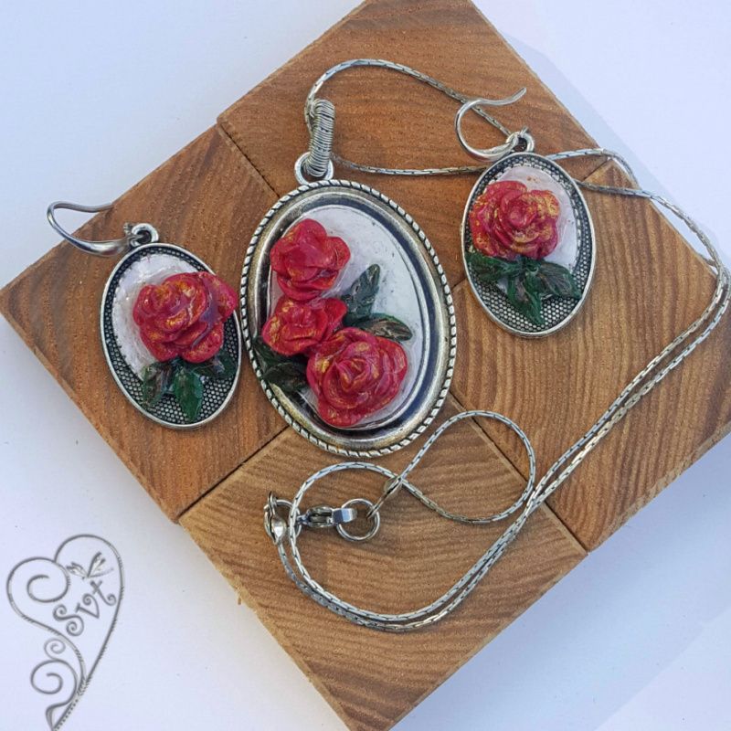 Комплект "Красная роза" выполнен на основе из бижутерного сплава, розы - полимерная глина, залиты ювелирной смолой. Цветы объёмные, каждый лепесток выполнен вручную. Повторить в точности такое изделие невозможно, поэтому все изделия в единственном экземпляре.