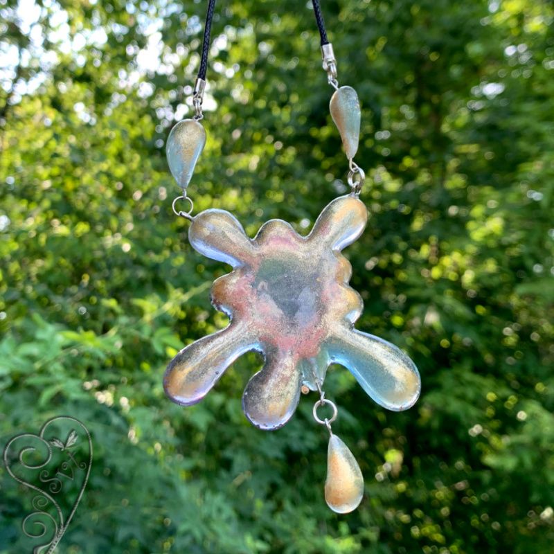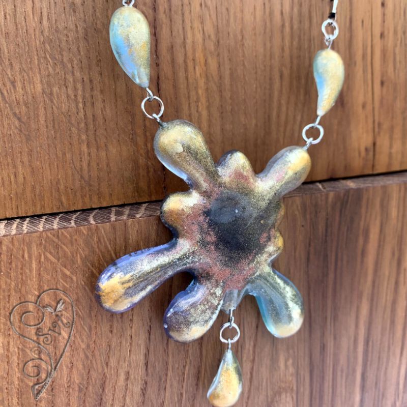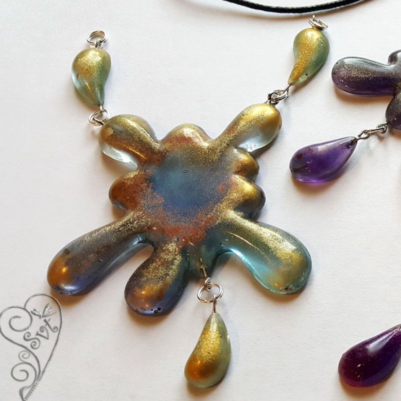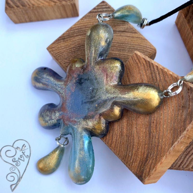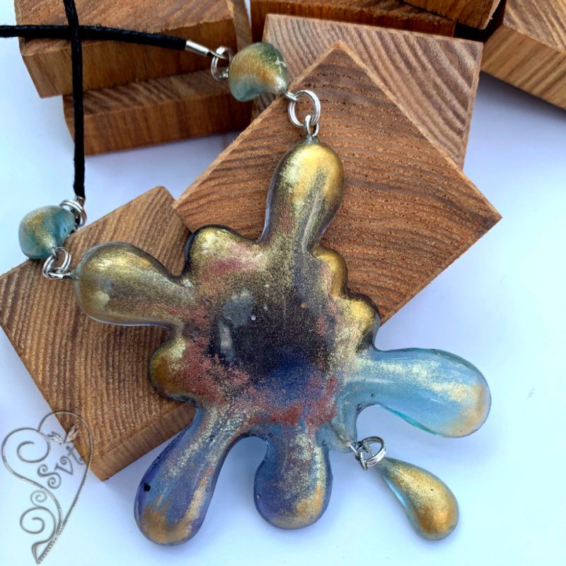 Сделать свой образ оригинальным можно с помощью вот такой настоящей кляксы. Выполнена из полупрозрачной эпоксидной смолы. Золото с бронзой, красиво играет на солнце, цвет перетекает из бирюзового в голубой. За счет частичной прозрачности, берет на себя цвет одежды.