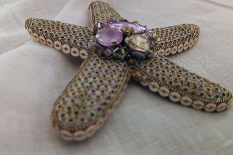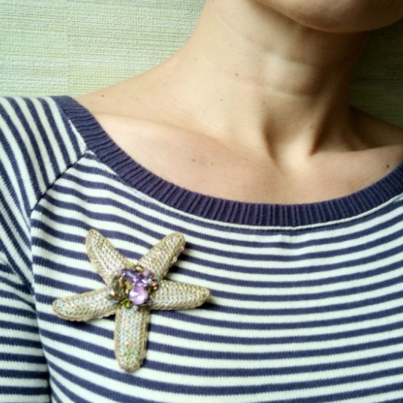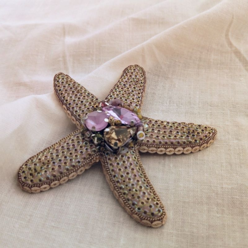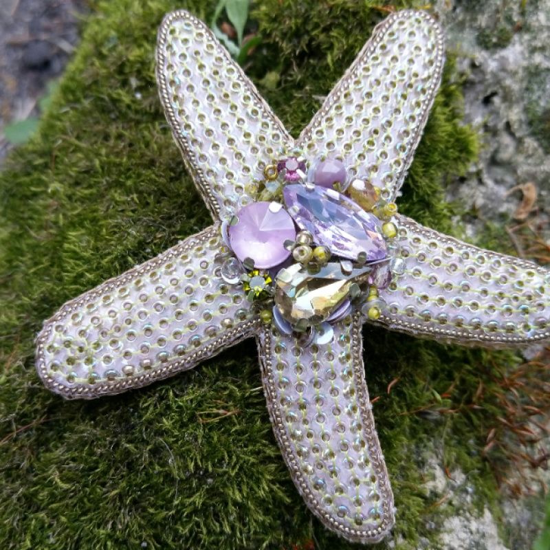 Брошь Морская звезда вышитая вручную. Украшенная стеклянными хрусталь, яплнським бисером и чешскими хрустальными бусинками. Обратная сторона броши - эко-кожа золотого цвета и японская булавка. Размер 7 см. Продается в подарочной упаковке.