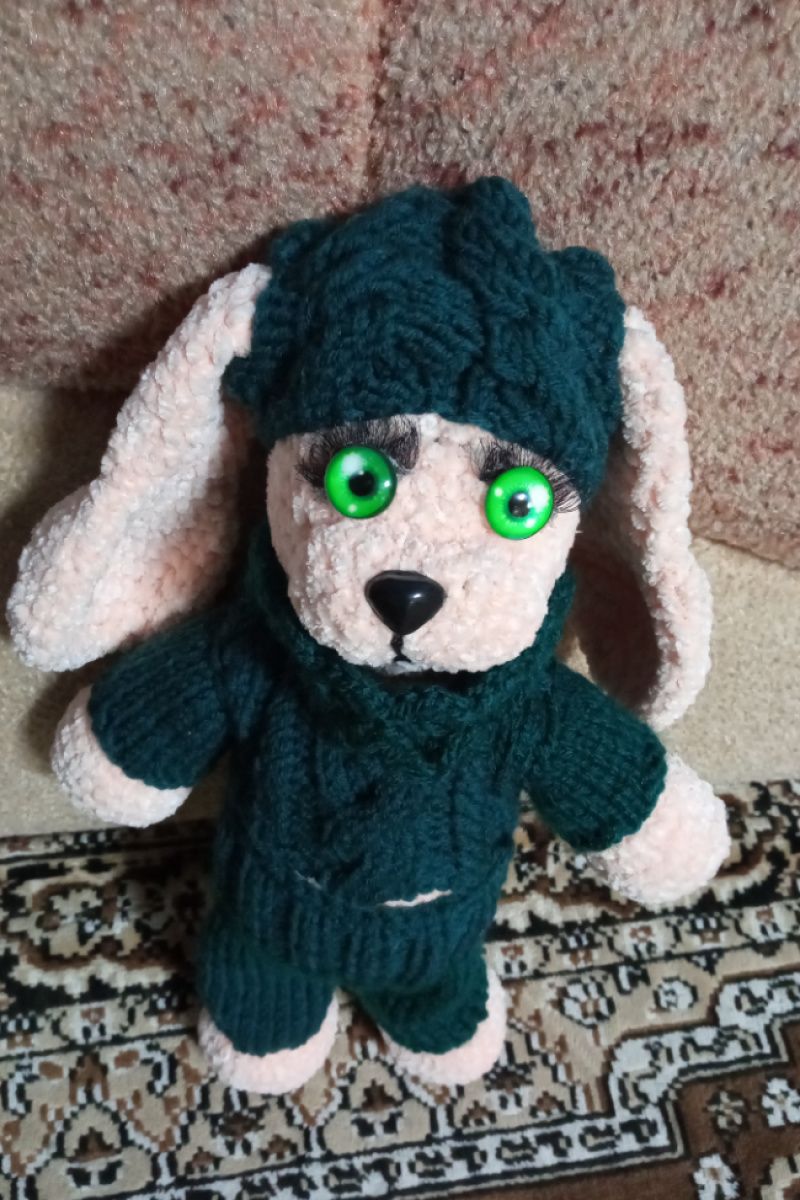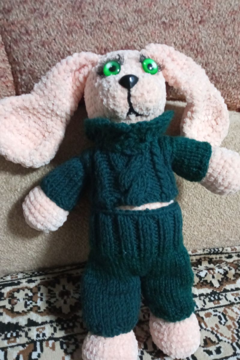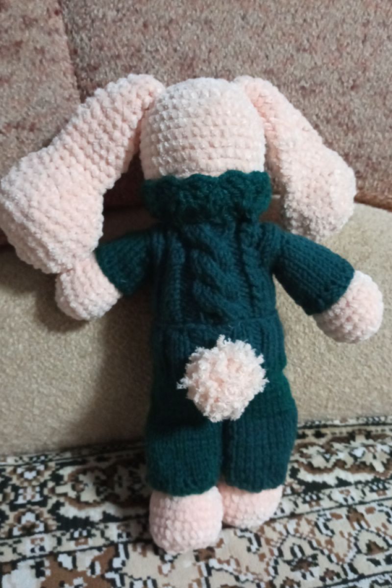 Зайка изготовлена из плюшевой пряжи, наполнена халофайбером. Одежда снимается.
