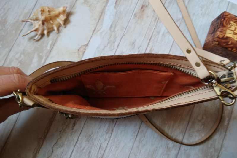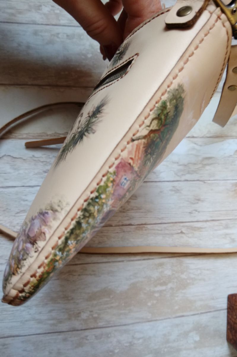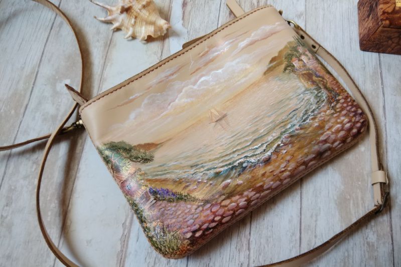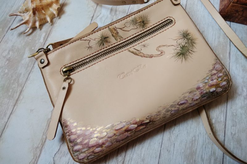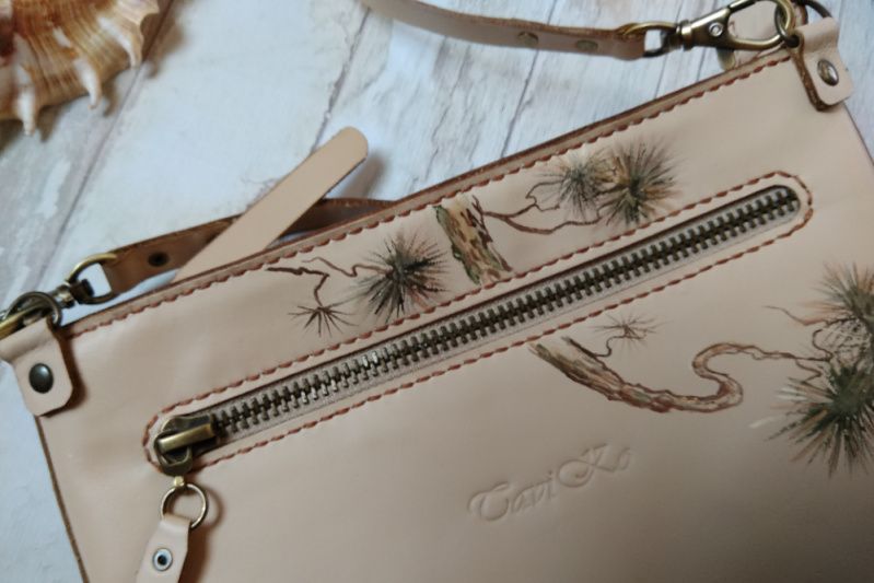 Клатч выполнен из натуральной кожи светлого бежевого цвета. Украшенный росписью на лицевой и обратной стороне сумки профессиональными красками для кожи. Край деталей тонирован в темно-коричневый цвет. Прошитая вручную вощеной нитью седельным швом, гарантирует максимальную прочность швов. На обратной стороне сумки имеется карман на молнии (YKK). Внутри небольшая открытая карман. Подкладка - американский хлопок. Закрывается на молнию. Клатч прекрасно держит форму. Съемный ремень 120 см с регулировкой длины. Фурнитура качественная, цвет антик
