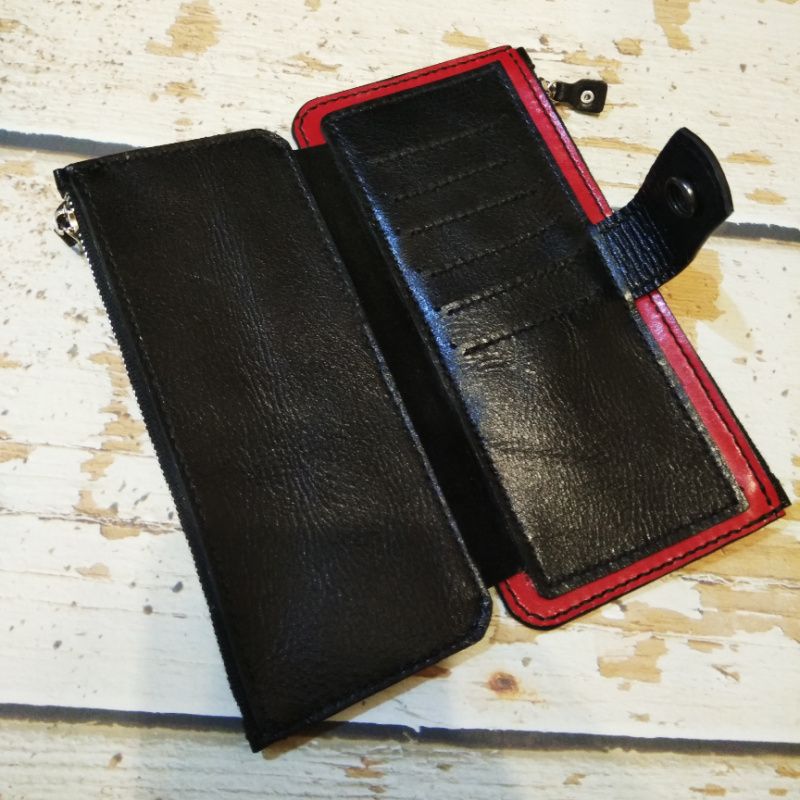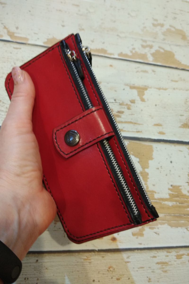 Данная модель кошелька полностью ручной работы. изготовлена из высококачественной итальянской кожи КРС FORINI-Vegetale растительного дубления, и итальянской кожи КРС черного цвета. Края тонированы итальянской профессиональной краской. Благодаря своей конструктивной простоте кошелек чрезвычайно вместителен и удобен. Имеет 2 кармана на молнии, и 6 карманов для визиток и банковских карт. Кошелек закрывается на кнопку