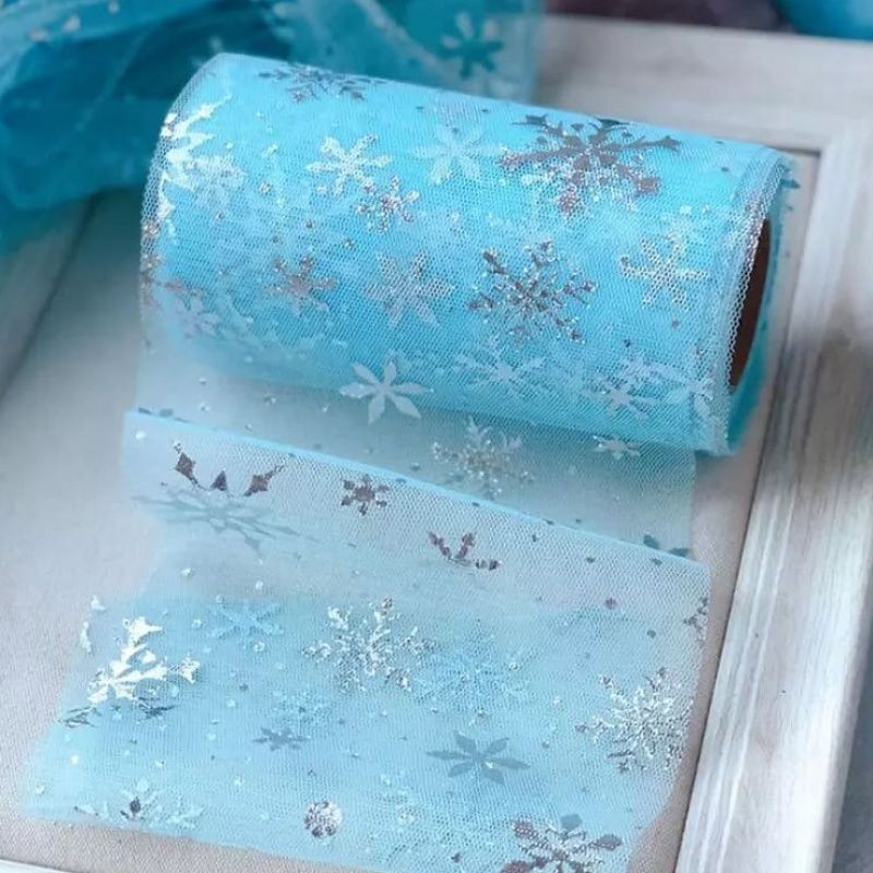 Фатин голубой с серебряными снежинками