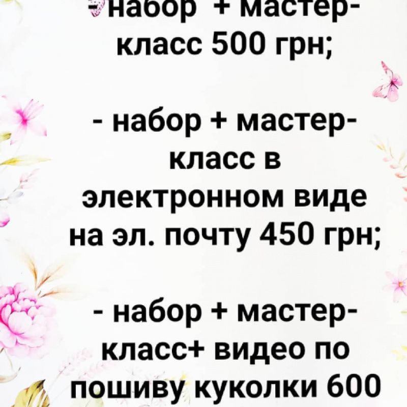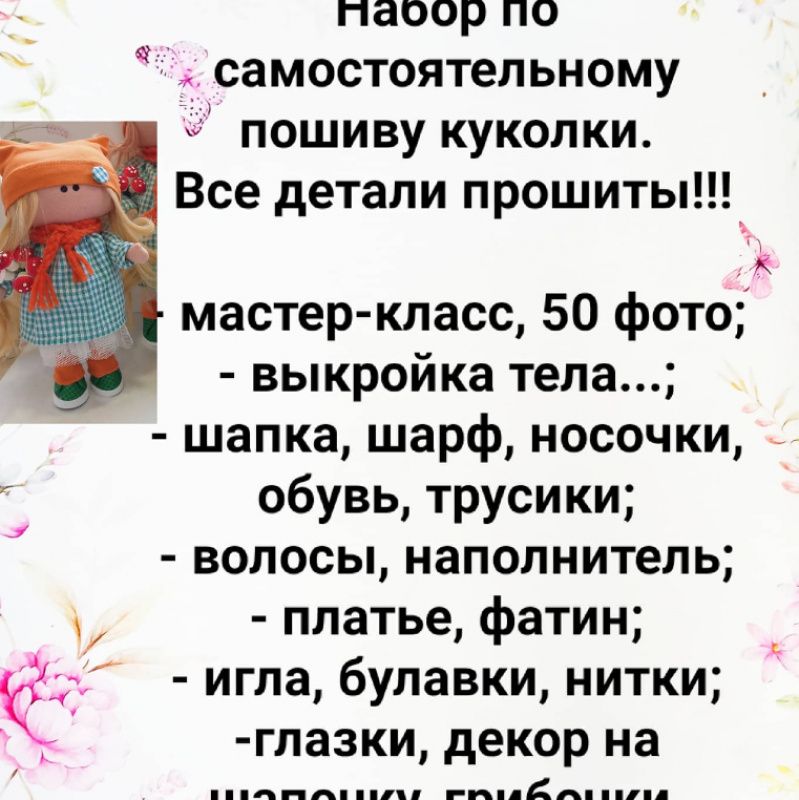 В наборе есть всё необходимое, чтоб пошить куколку, даже наполнитель, все детали прошиты, швейная машинка не нужна. Есть в наборе пошаговый мастер- класс с 50 цветными фотографиями.