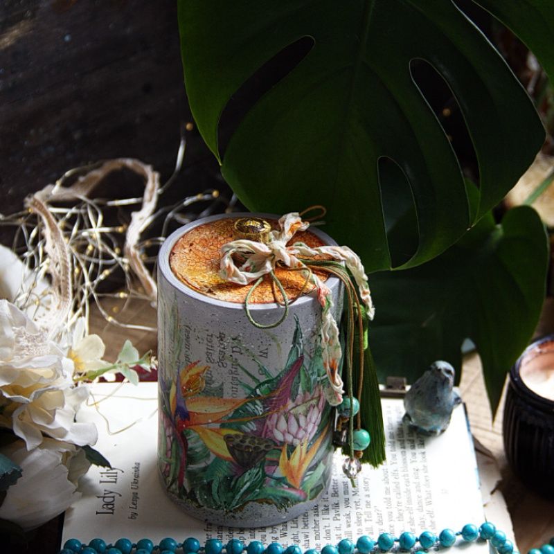 На бочонке изображены растения экзотические и монстера там тоже есть, поэтому пришлось свою живую монстеру в ведре тащить на балкон)