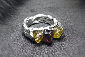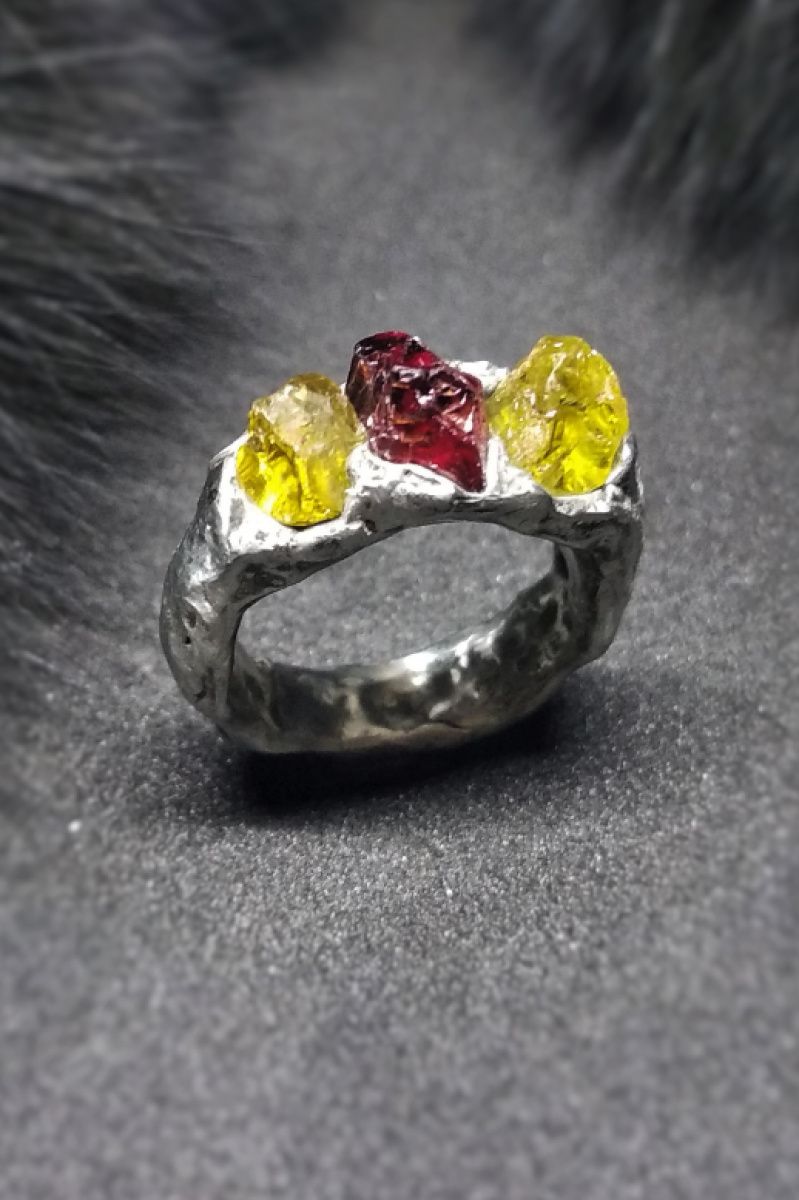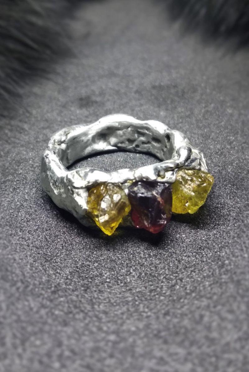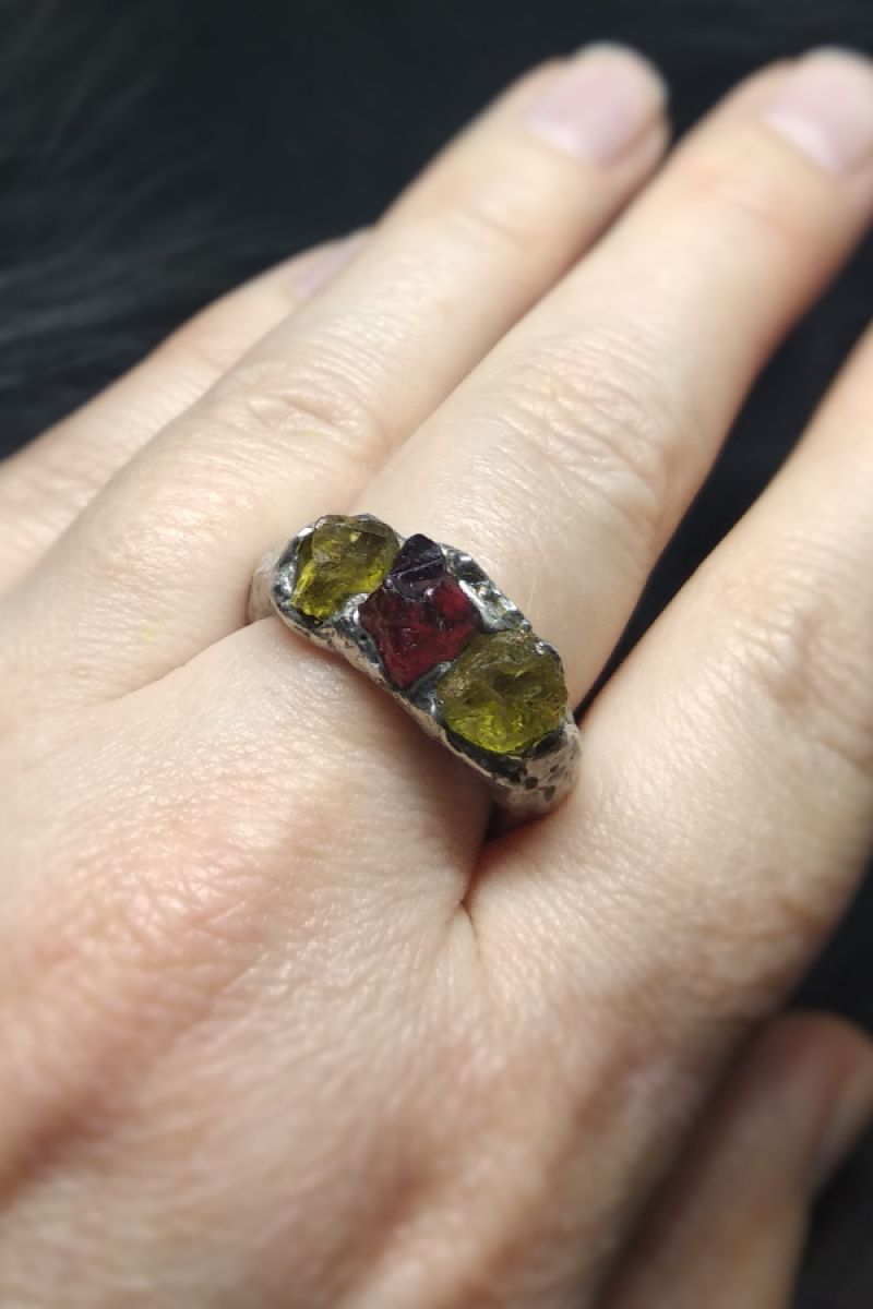 Кольцо Гранатовое, самородки зеленого граната-гроссуляра и красного граната-альмандина. металл-сплав олова, меди, серебра, размер 18.5, возможно небольшое увеличение размера