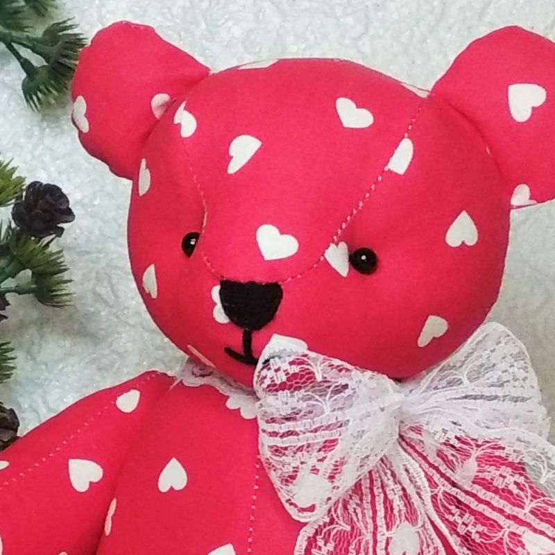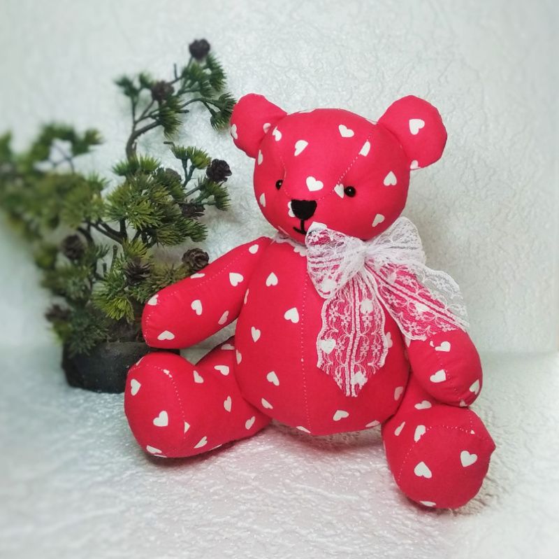 Яркий мишка в сердечках сшит из хлопка, наполнитель-холлофайбер, лапки подвижны, на пуговичном креплении, рост игрушки 28 см. Замечательный подарок по поводу и просто от души.