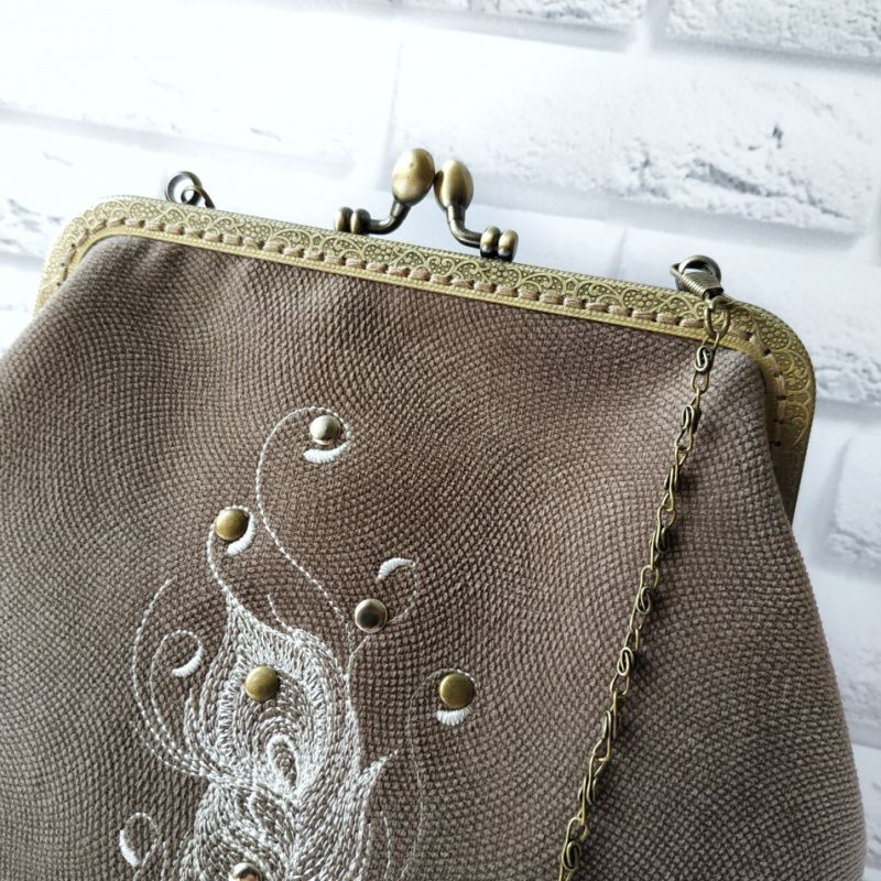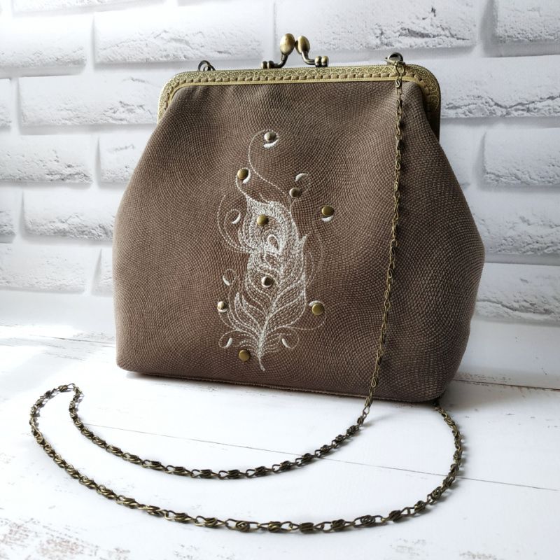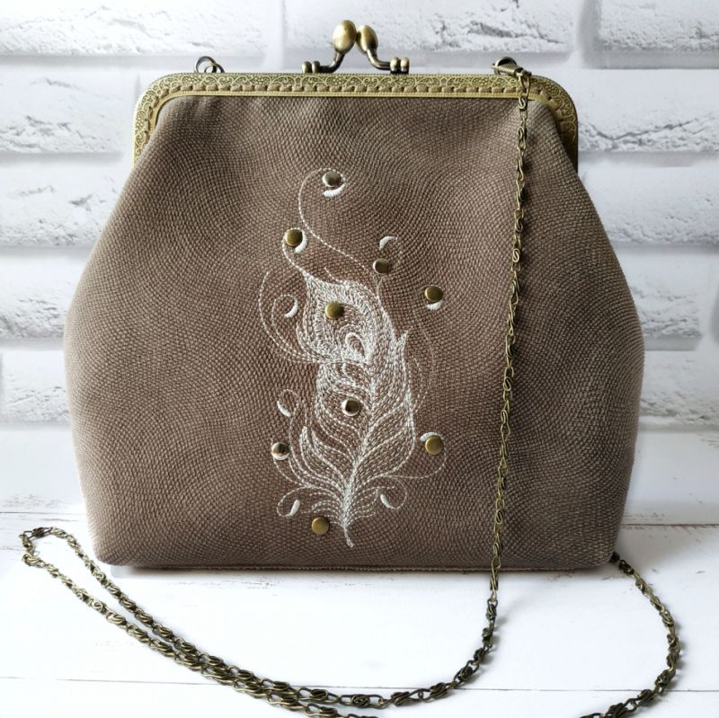 Эта сумочка сшита из плотного велюра, цвет ′МОККО′. Украшением сумочки стала вышивка перышко, которое придает ей изящность и легкость.