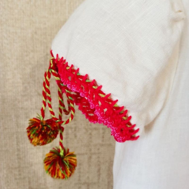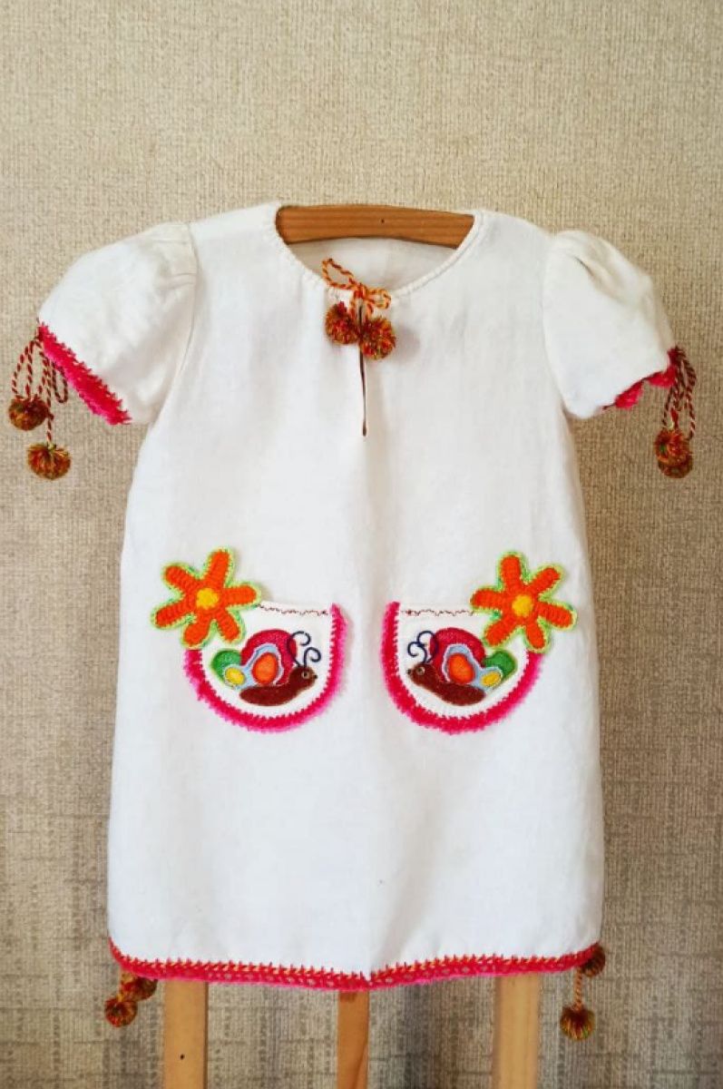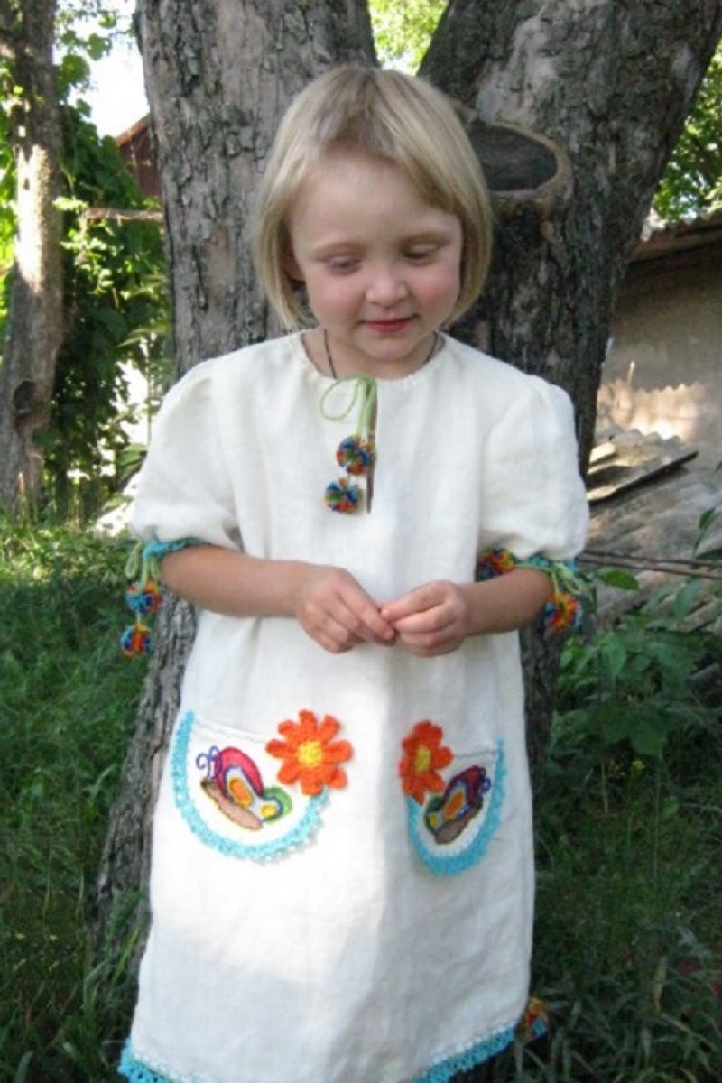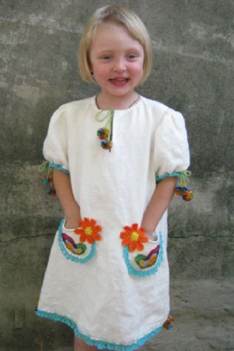 На белом льняном полотне, среди цветов, встретились две яркие бабочки. Их крылья сверкали на солнце цветным бисером. Они слушали как ветер играет кругленькими углами. А дочь держала свои Бабочки в ладонях... Размер платья универсальный: горловина, объем рукава и разделение регулируются. Доченька будет носить несколько лет. Натуральный лен светлого цвета, обеспечит в лету комфорт и хорошее настроение! по подоле 102 см