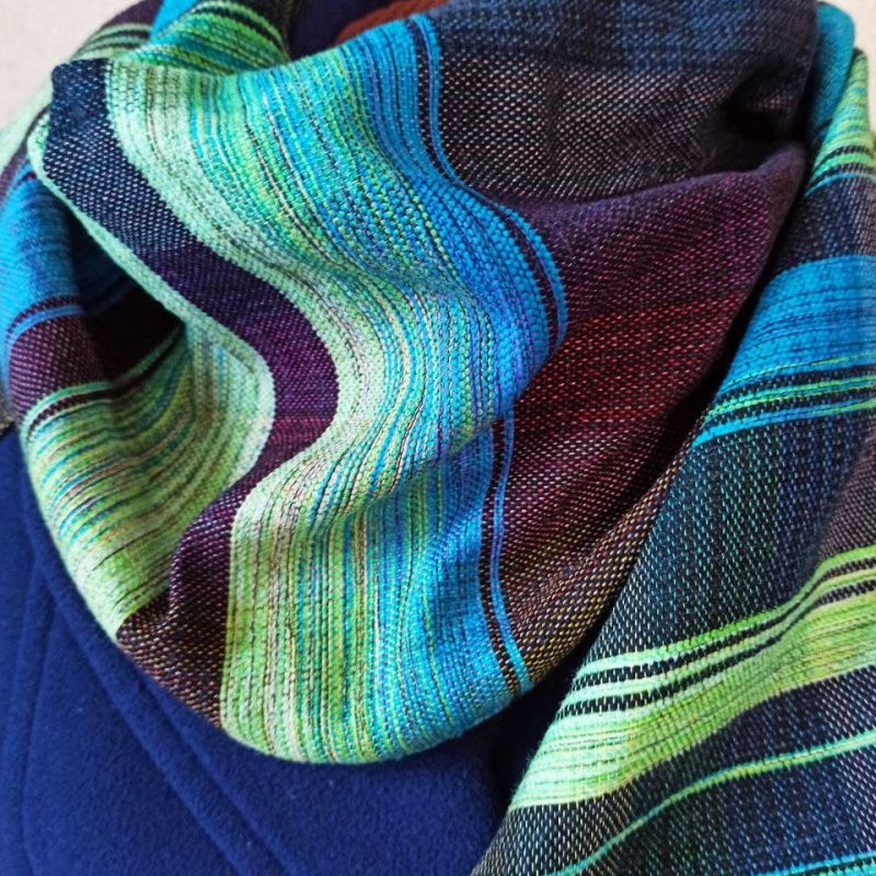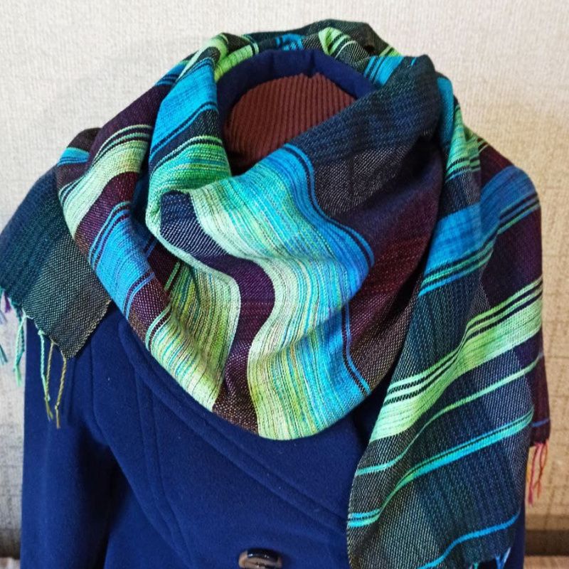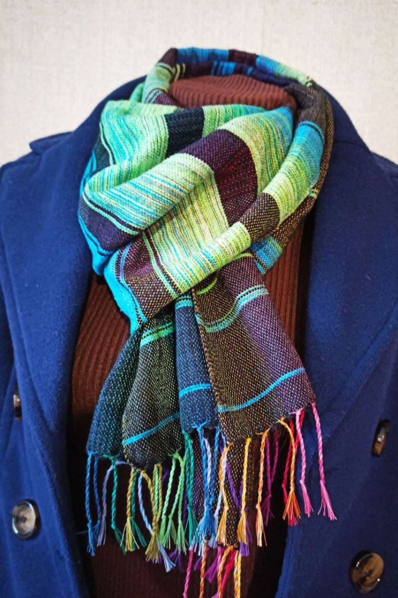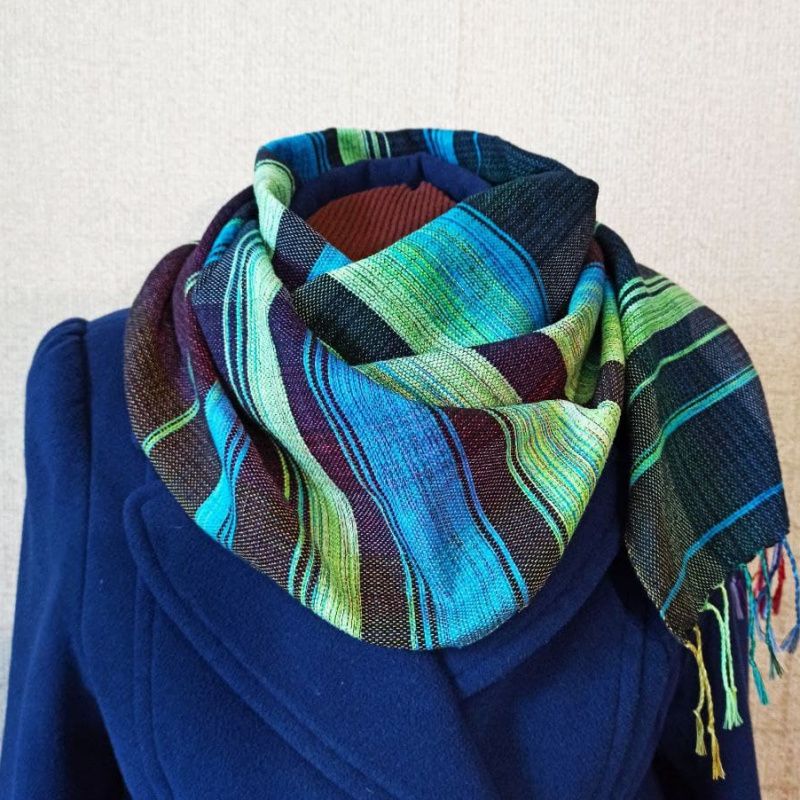 Отличный подарок для Вас и Вашей семьи! Мягкий и приятный на ощупь. Шарф изготовлен на ткацком станке из натуральных материалов. Полосатые оттенки синего и салатового на черном полотне, плавно перетекающие друг в друга, создавая градиент. Подчеркните свою индивидуальность и уникальность. Согреет Вас в любое время года... Размер 169х33 см
