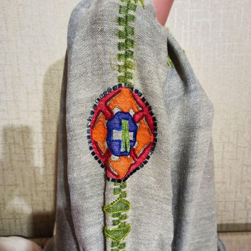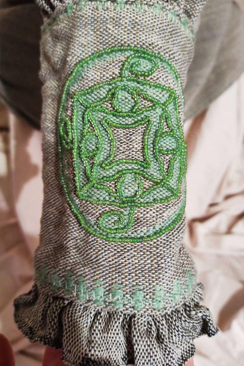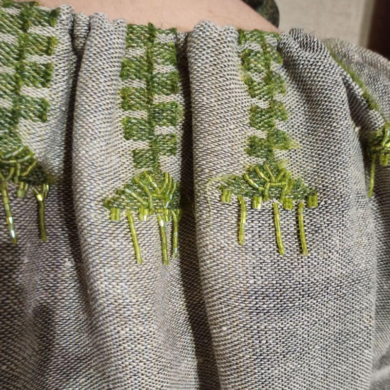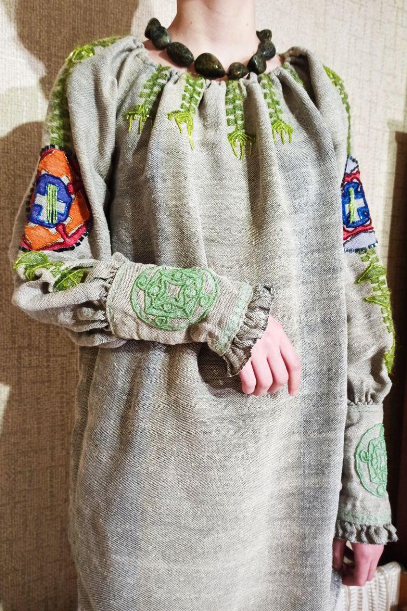 Женская рубашка соткана на ткацком станке из серого льна (не отбеленного). Уникальная работа. Авторская мысль. Единственная в мире, повторов не имеет В украшенном декоре закодированы древнеукраинские обереговые символы. Узор выполнен шерстяными нитями и бисером. Размер 42-46