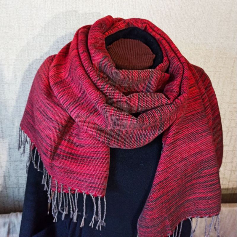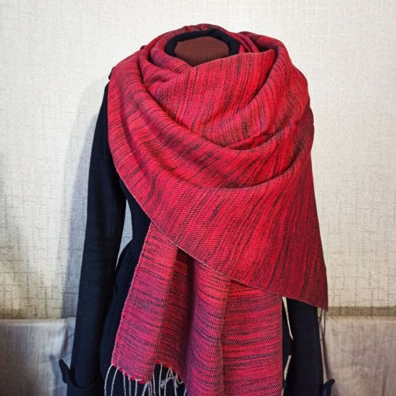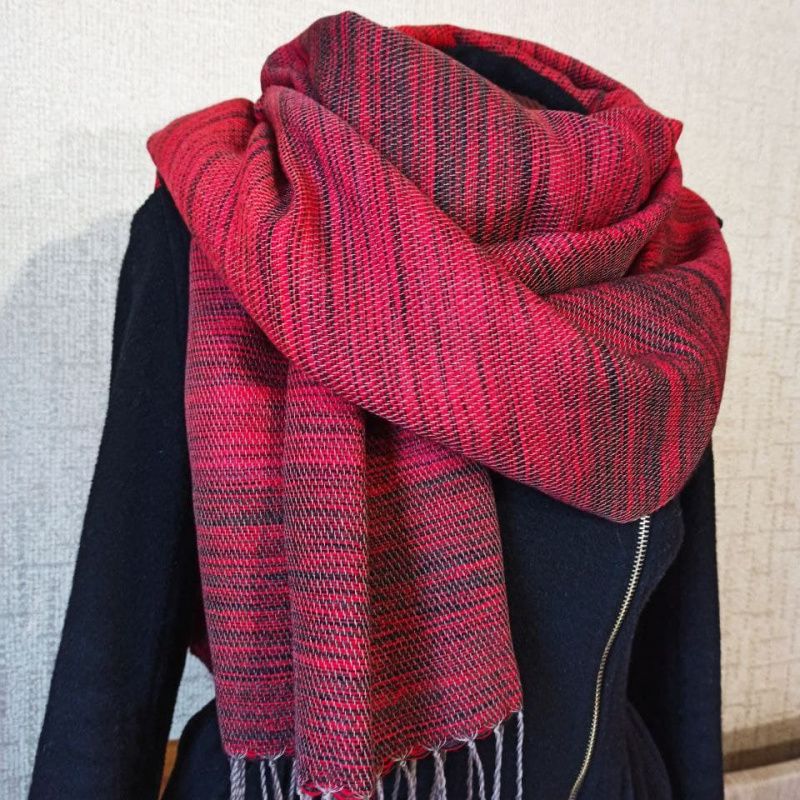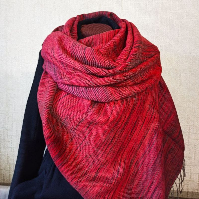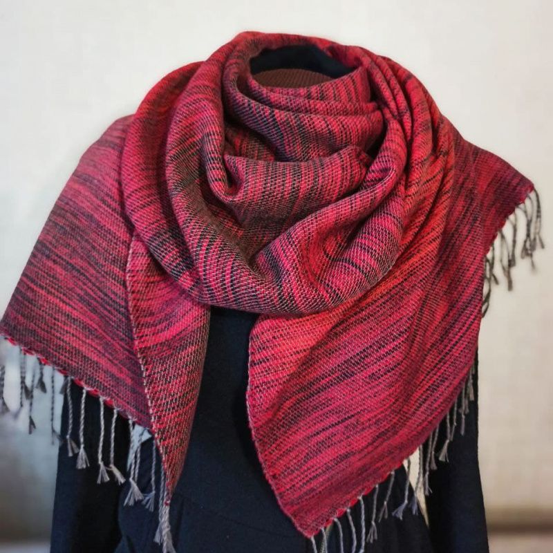 Домотканый шарф выполнен на ткацком станке из натуральных материалов (хлопка, шерсти и вискозы). Сочетание красного и черного цвета, которые плавно перетекают друг в друга. Приятный и нежный на ощупь, он согреет Вас в любое время года… Размер 172х62 см