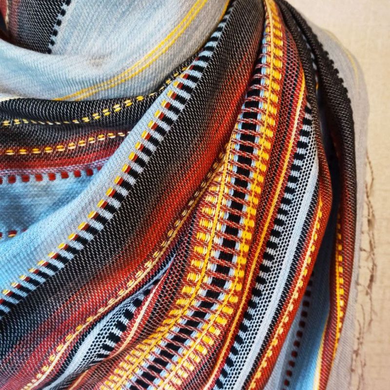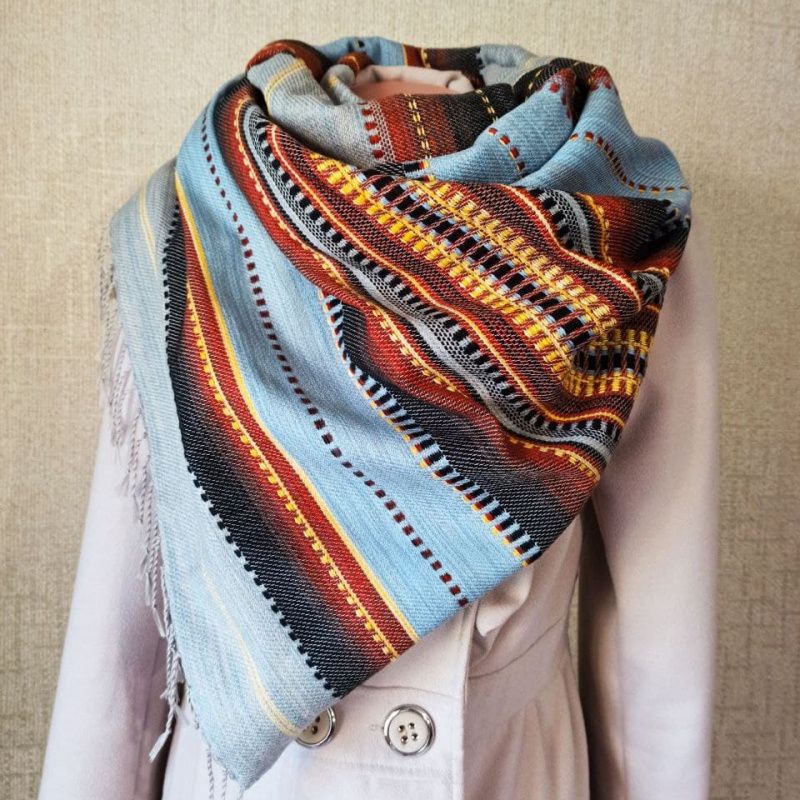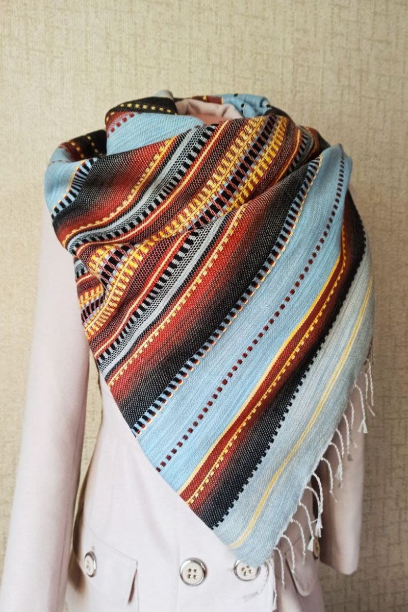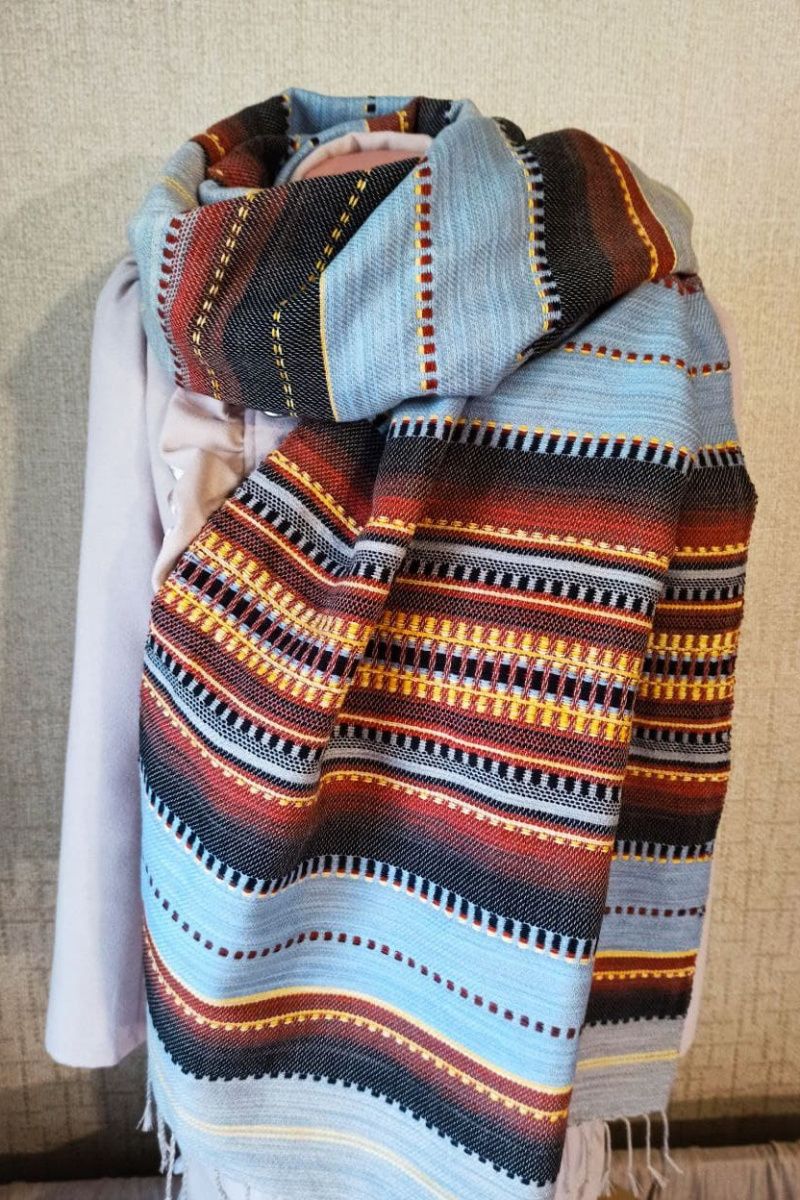 Отличный подарок для Вас и Вашей семьи! Шарф выполнен на ткацком станке из натуральных материалов - хлопка, шерсти и вискозы. Размер 168х63 см. Приятный и нежный на ощупь. Красивый широкий шарф украсит ваш образ и согреет в любое время года.