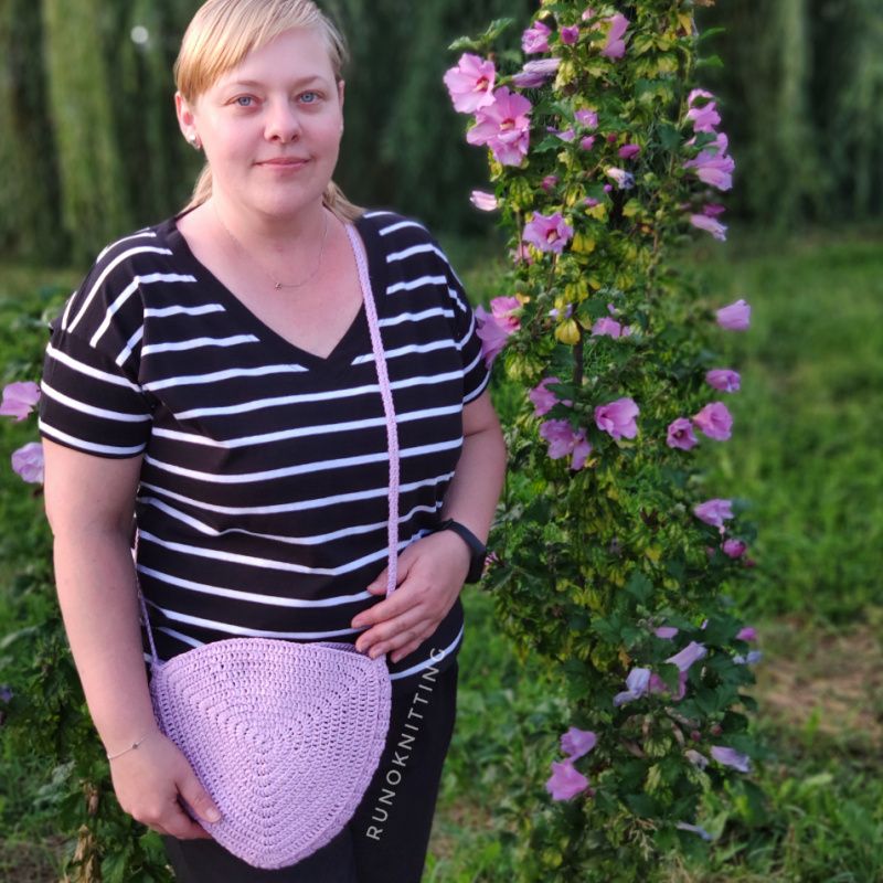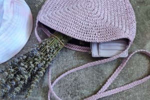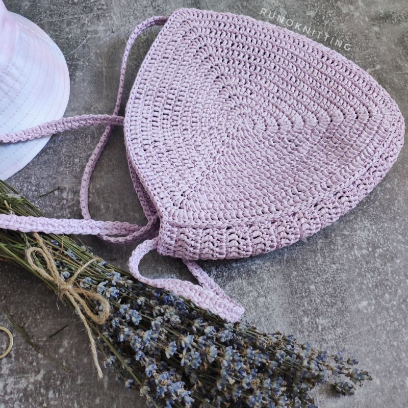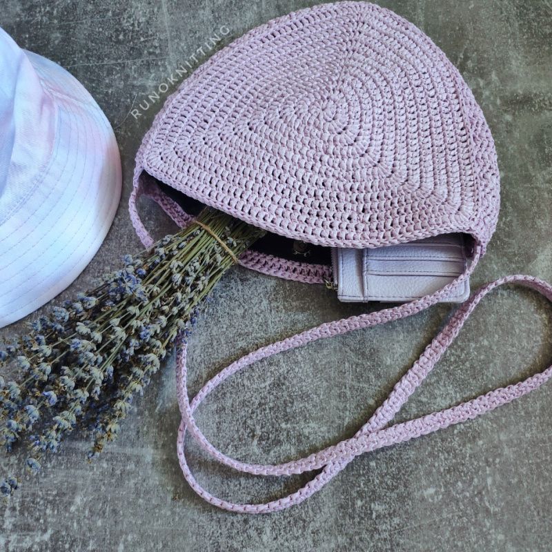 Легка и зручна літня сумочка кросбоді у популярному лавандовому відтінку. В'язана з рафії гачком. Має гарний чорний підклад з маленькою кишенькою на хастібається на магніт.