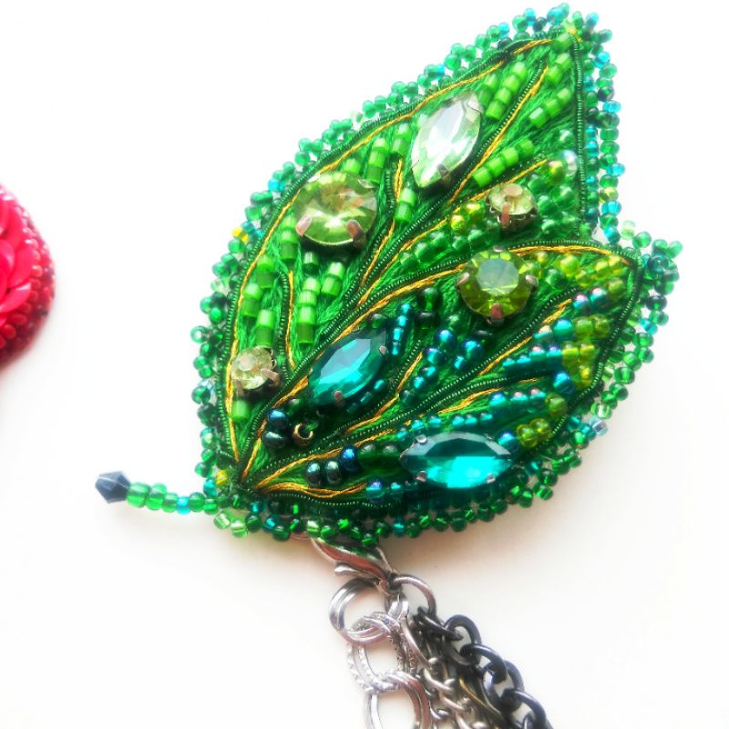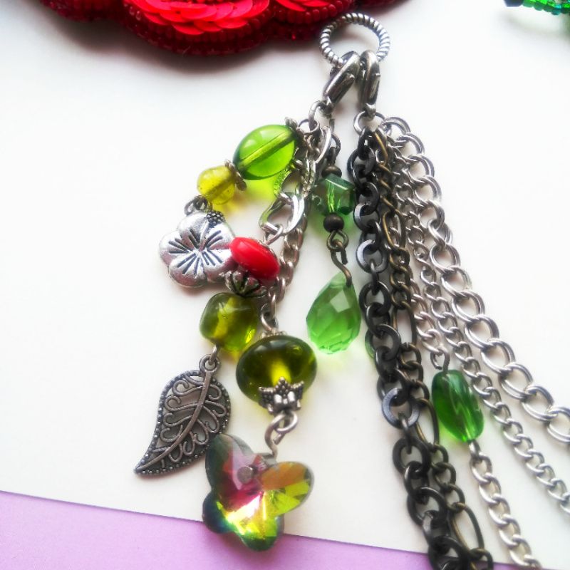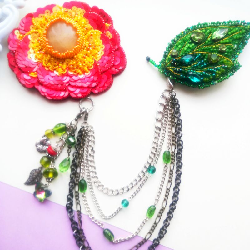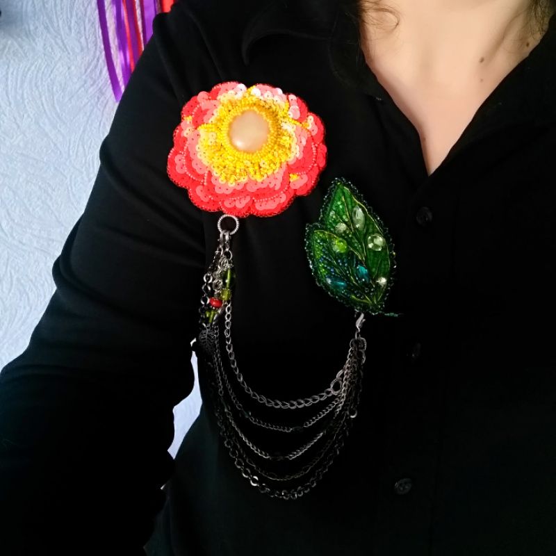 Большая самостоятельная брошка Цветок с центральным элементом - крупным желтым натуральным топазом и + брошка Листья со стразами, соединены между собою разно-фактурными съемными цепями (крепятся карабинами к брошкам) и отдельная съемная кисть с чешскими бусинами, подвесками и хрустальной бабочкой.