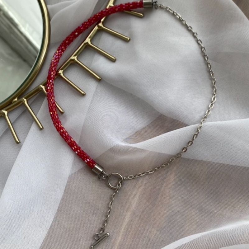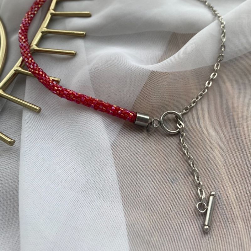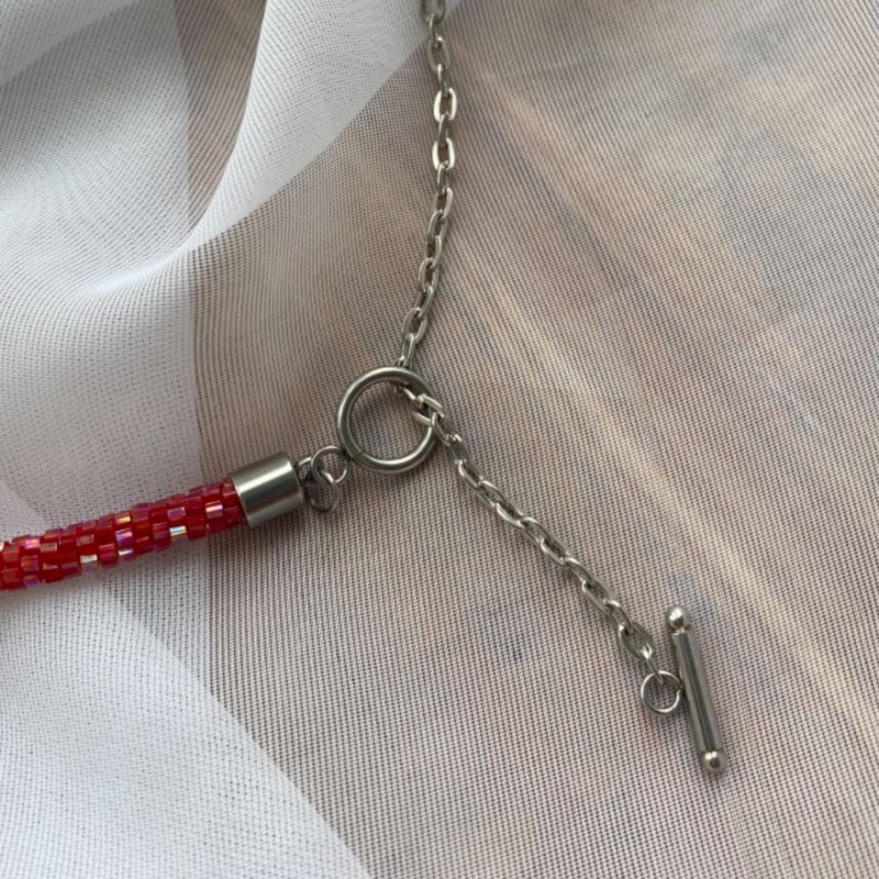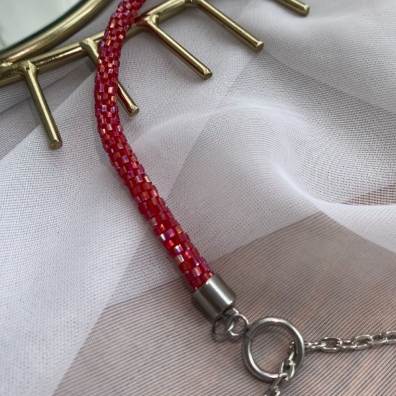 Модель: Transparent-Rainbow Lt Siam Ruby Яркий и стильный жгут на шею с цепью под любой стиль и внешность, сделанный из качественного японского бисера, застежка и цепь из нержавеющей стали. Плетется крючком, что дает возможность жгуту иметь тонкий круглый вид и прочность. Длина изделия - 40-45см. На заказ возможен любой цвет, дополнительно кольцо такого же цвета, браслет и серьги (гвоздики - основа серебро 925 пробы, кольца из нержавеющей стали) Подарочная упаковка и скидка на следующий заказ!