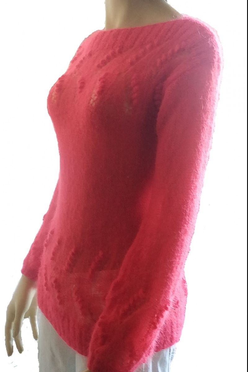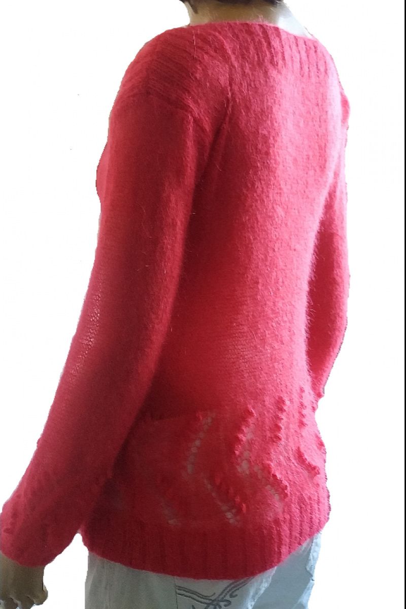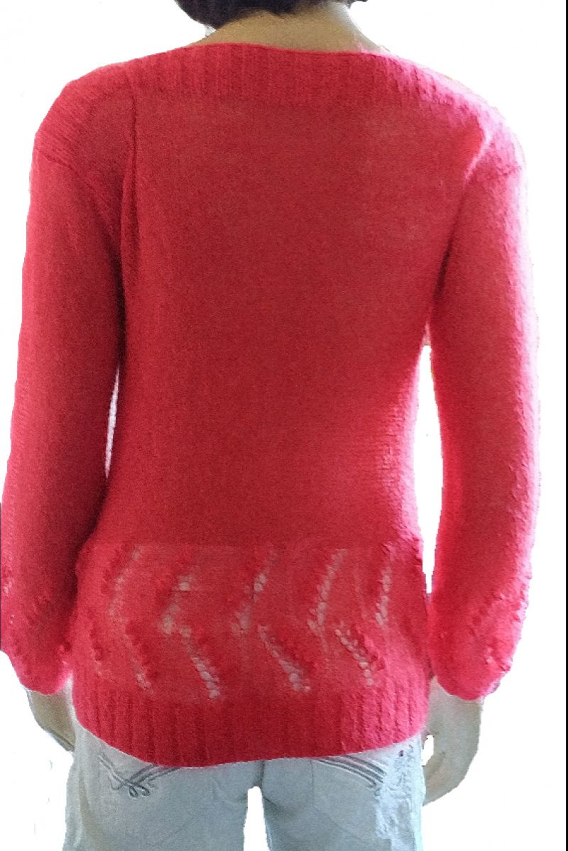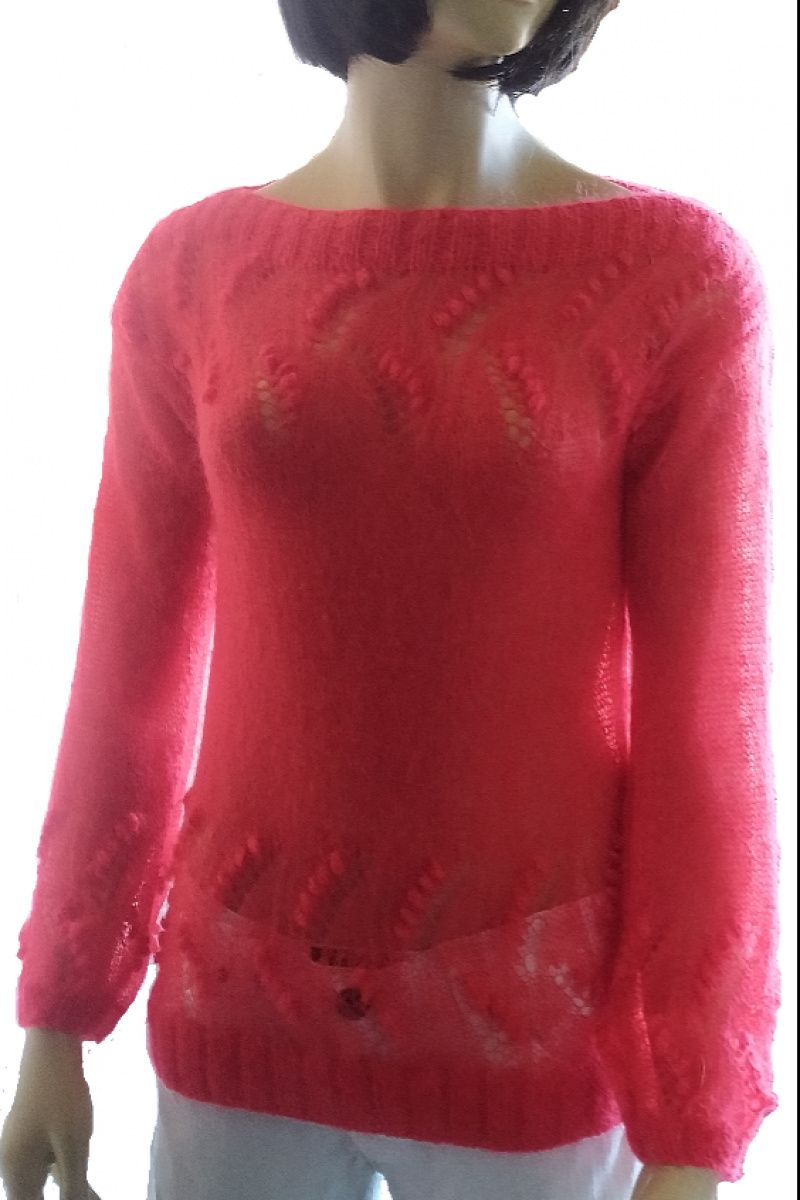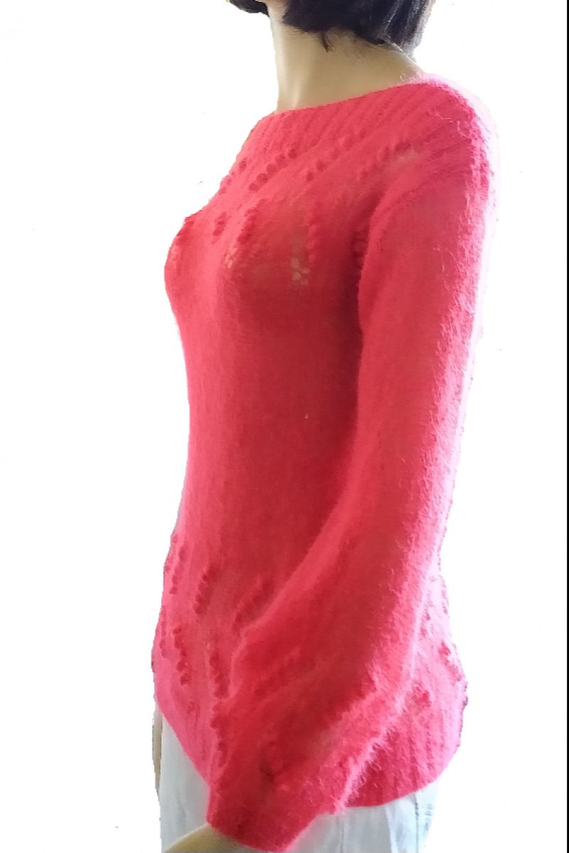 Красный пушистый свитер из тончайшего кидмохера. Свитер паутинка. Легкий, тонкий, невесомый и прзрачный повседневный свитер с ажурным узором с шишечками. Яркий и оригинальный отлично сочетается с любым низом. Вск резинки связаны в две нити. Детали постираны после вязки, поэтому свитер не вытянется.