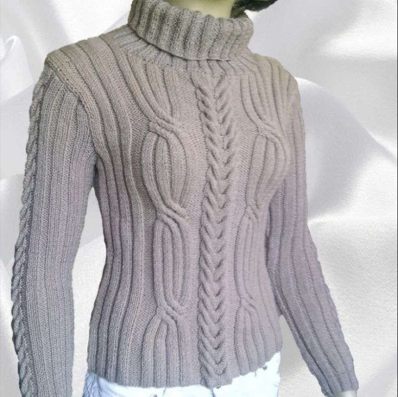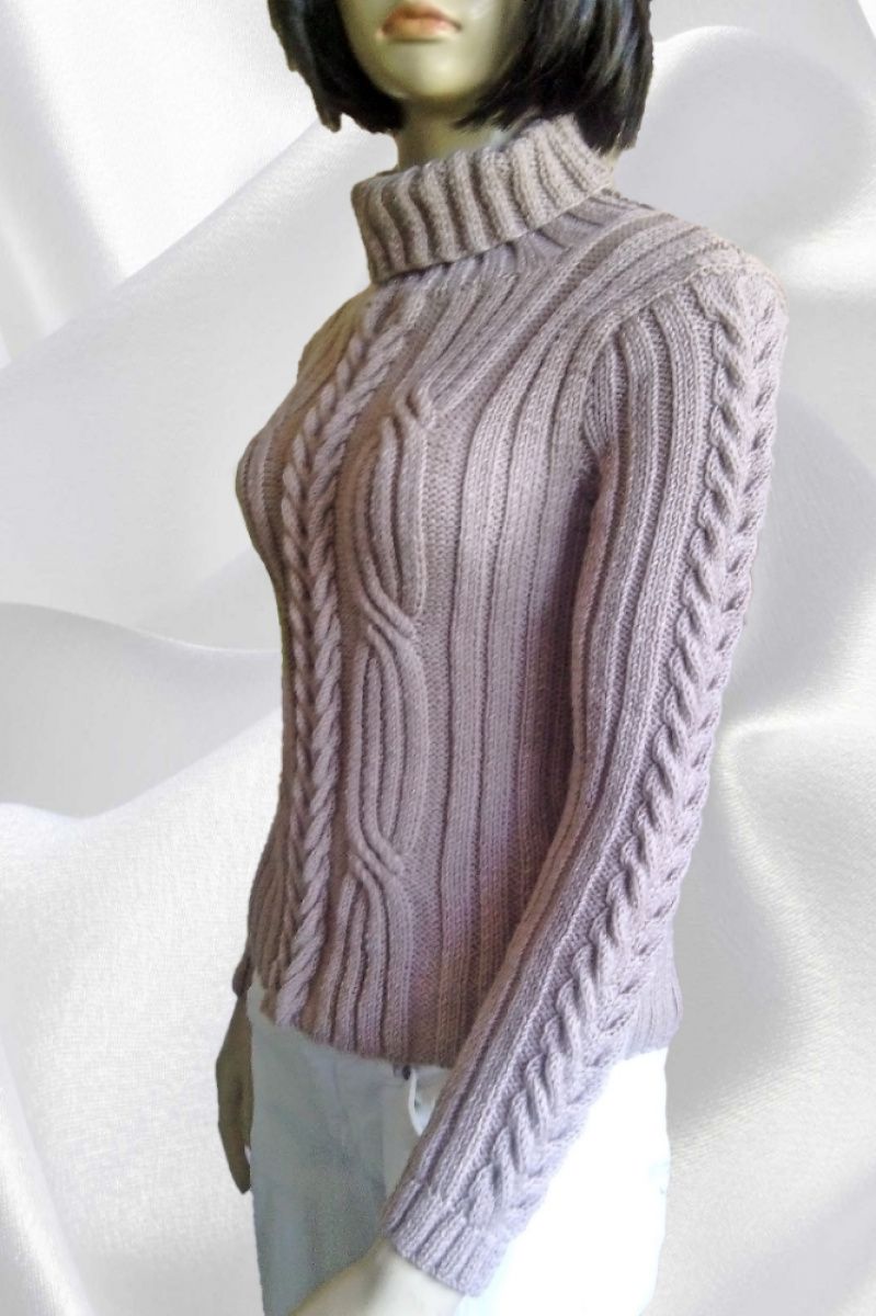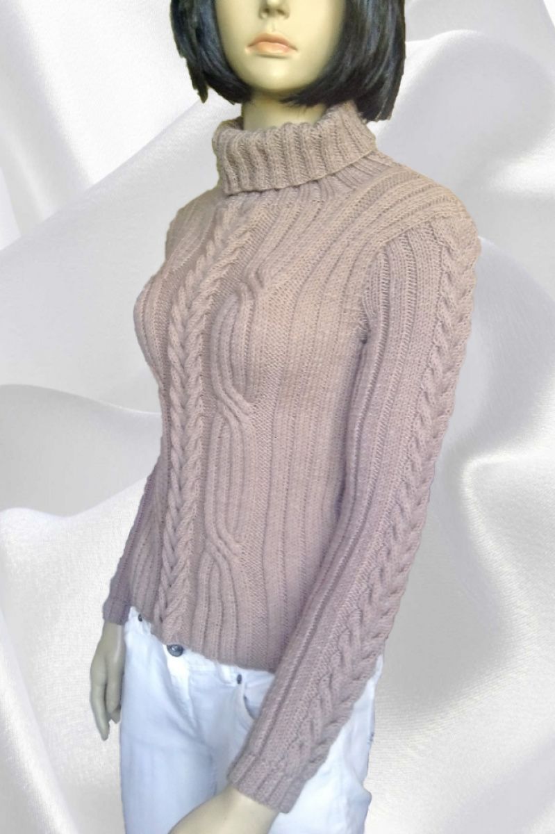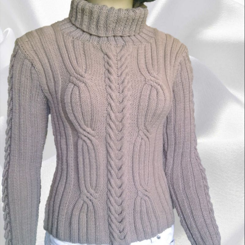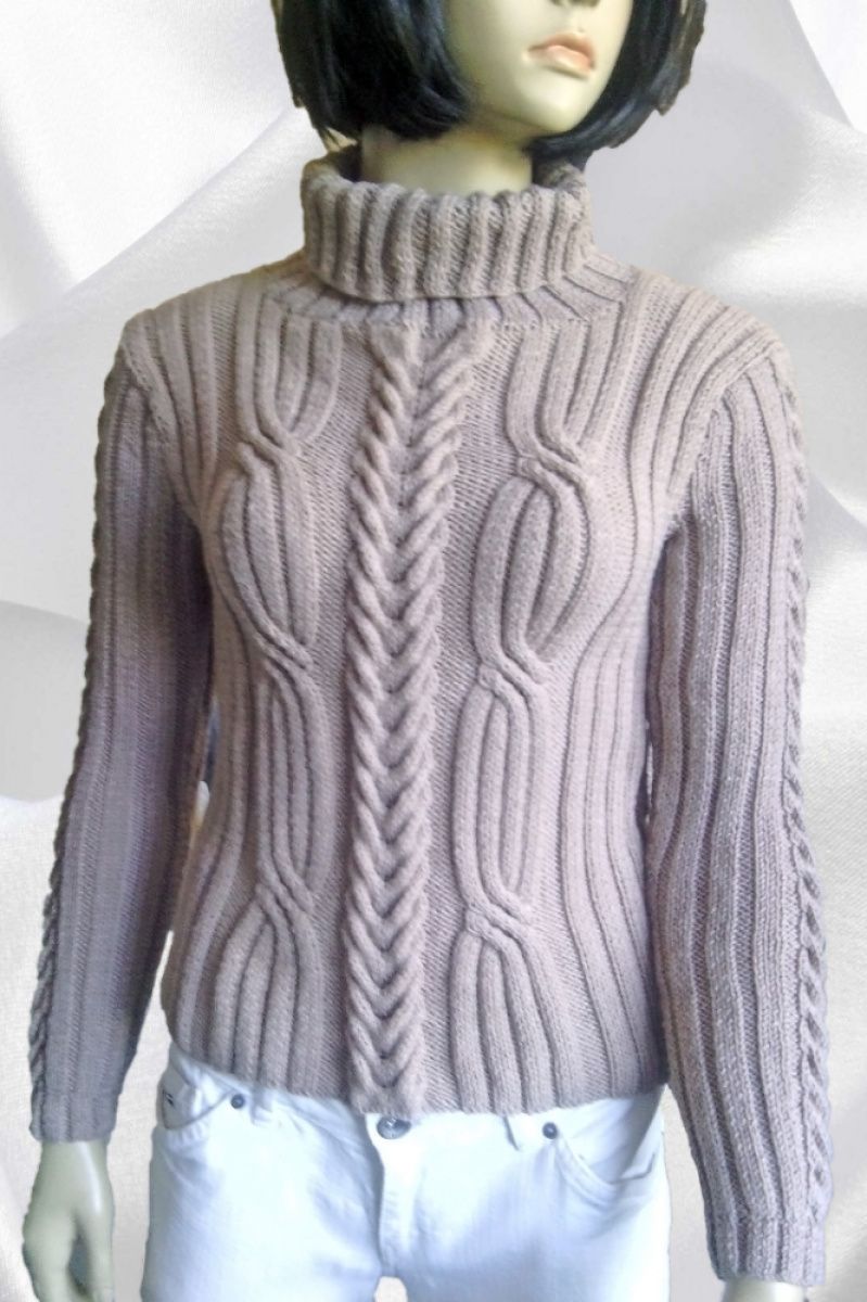 Женский зимний классический свитер с аранами под горло.Связан из мягкой теплой полушерсти. Рельефный арановый узор и коса в центре переда и на рукавах - акцент этой модели. Темно-бежевый цвет.