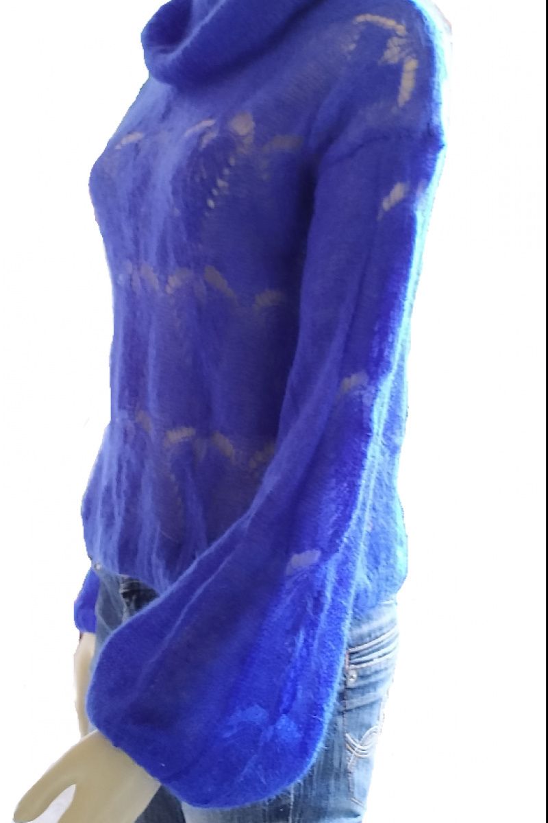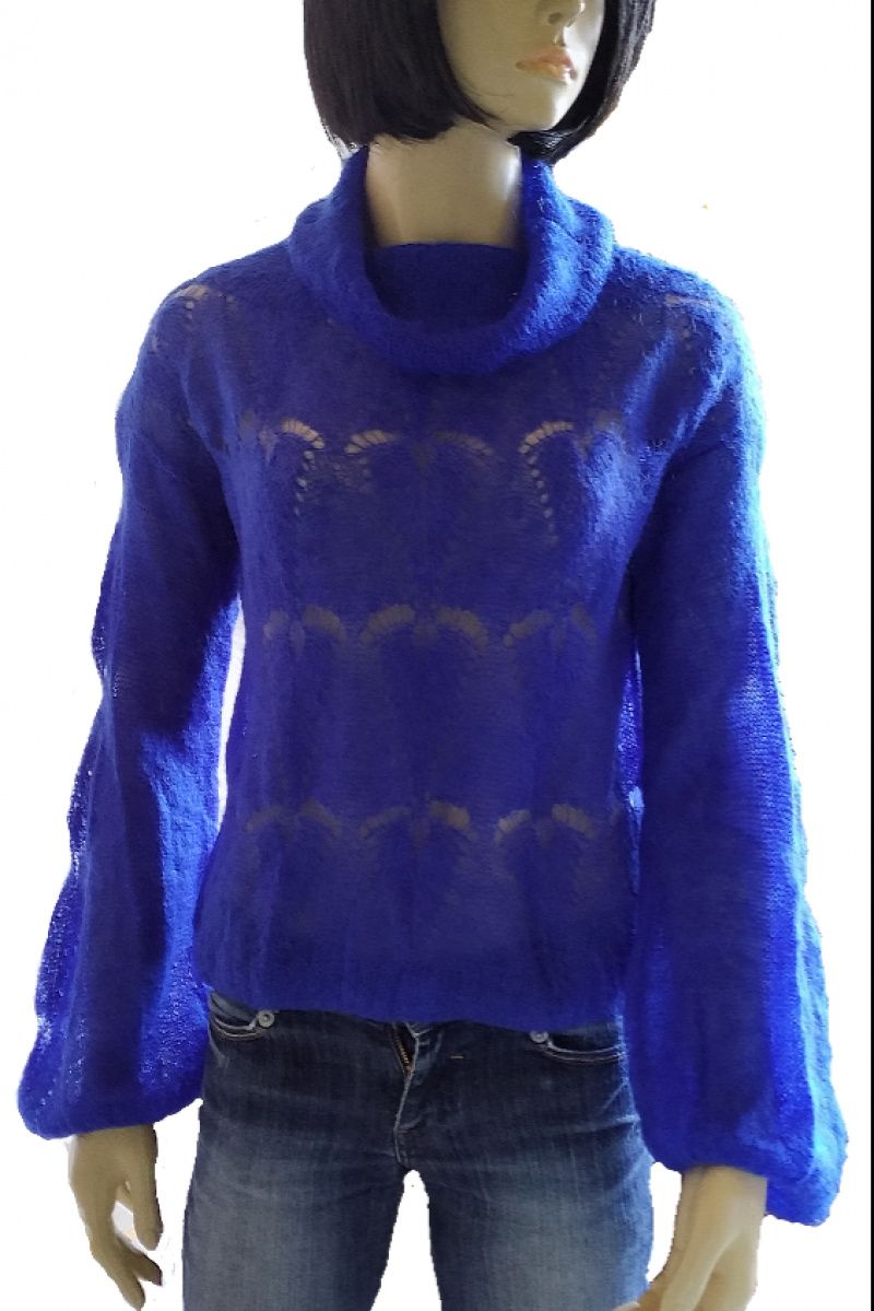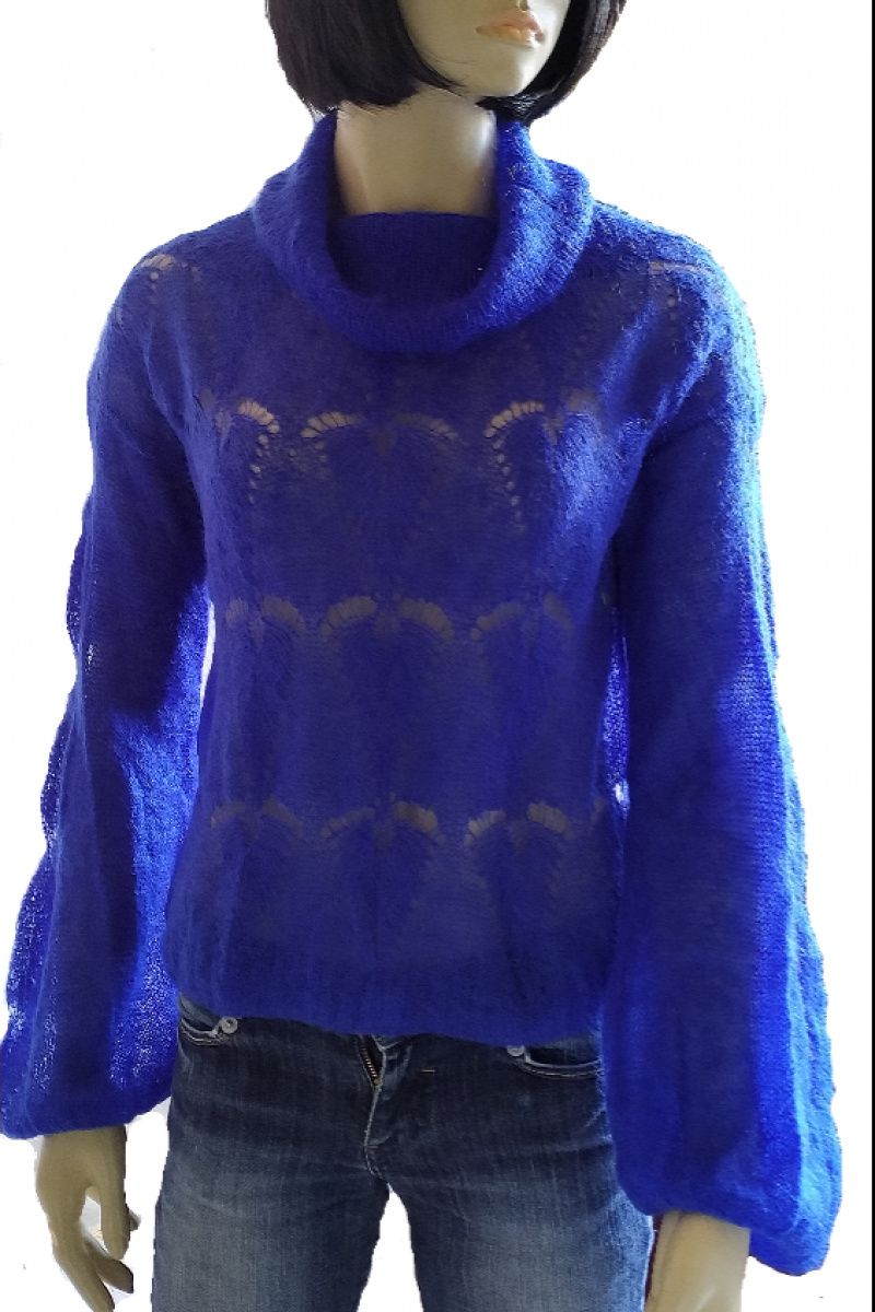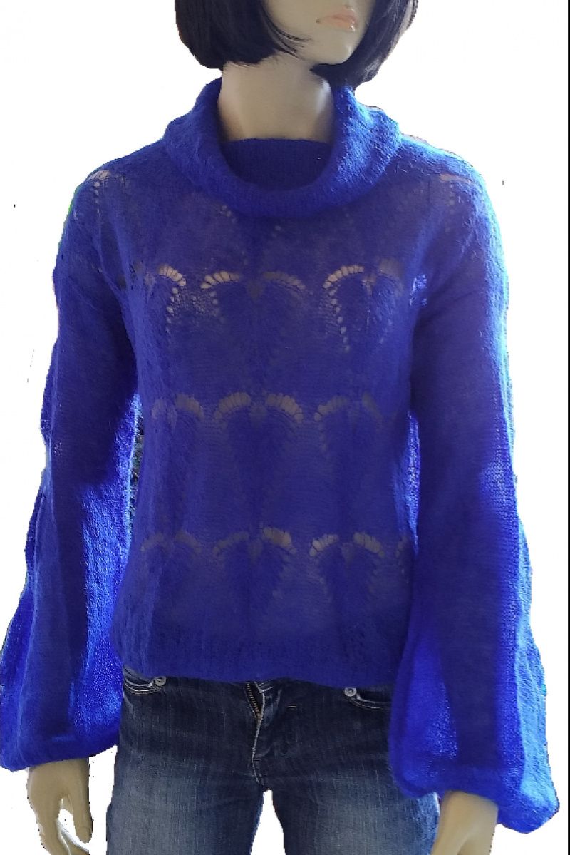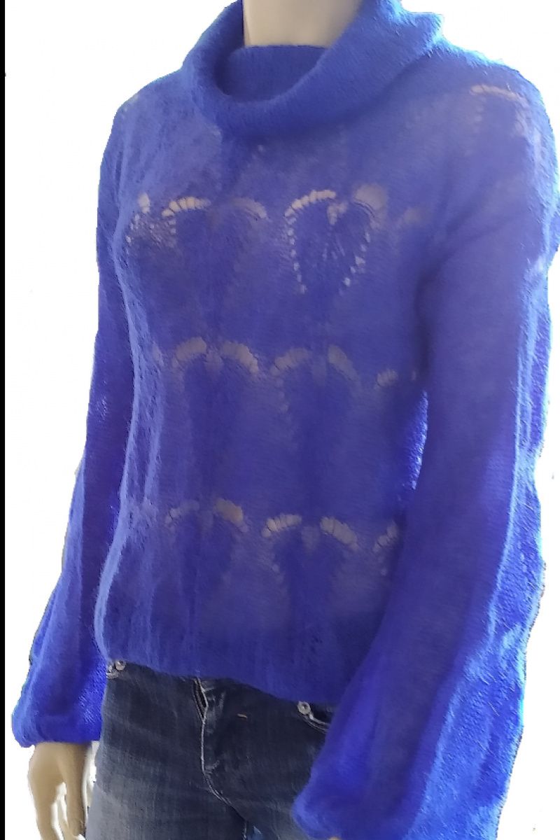 Тонкий, короткий пушистый свитер-паутинка из кидмохера с шалевым воротником. Невесомый, очень мягкий и шелковистый на ощупь. Узор -ажурный листья.