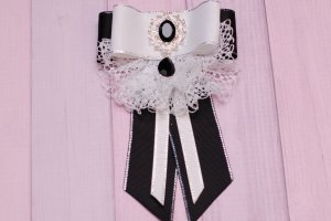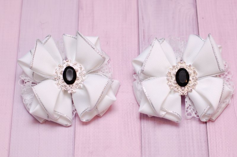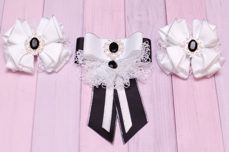 Нарядный комплект состоит из бантов (основа - резинки) и галстука. Выполнен в черно-белом цвете из качественных репсовых лент, декорирован красивой стразовой серединкой. Выглядит очень эффектно, подойдет как первоклашкам, так и девочкам постарше.