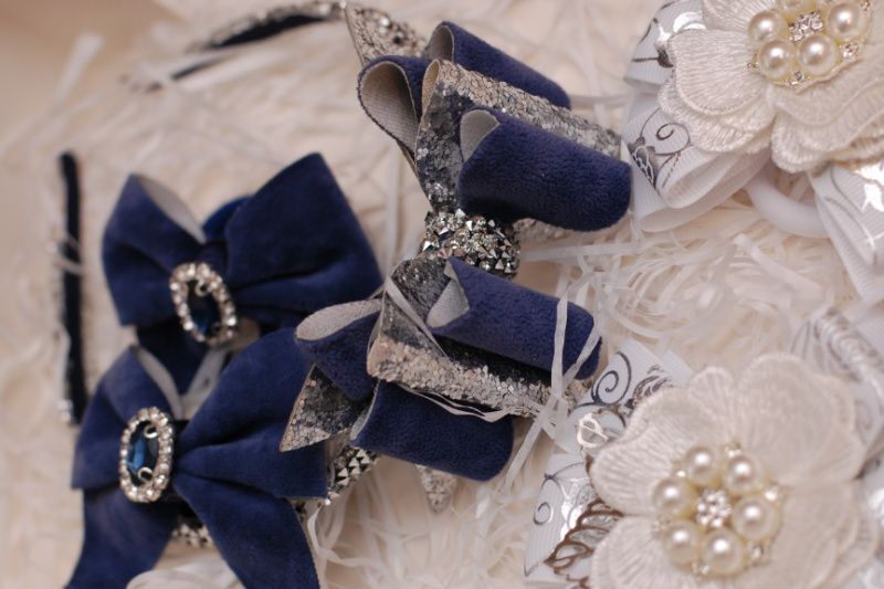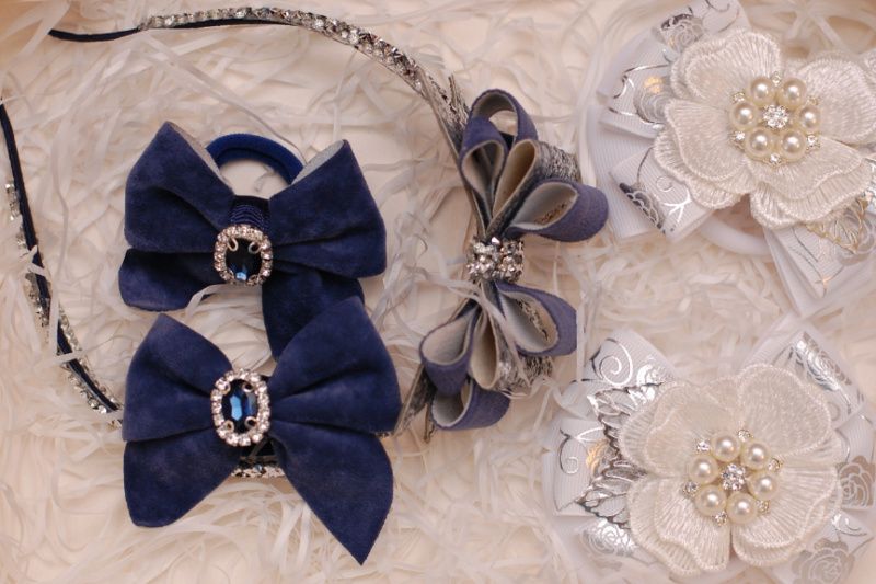 1 - обруч с сине-серебристым бантом из экокожи и бархата размером 9*5,5 см