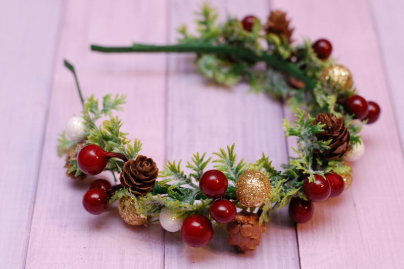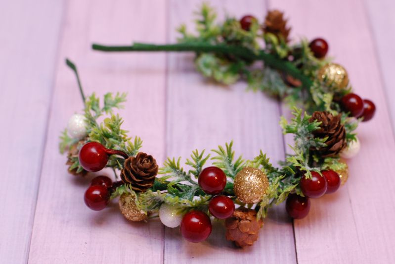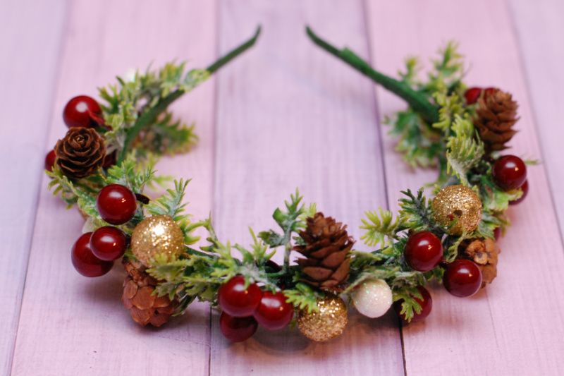 Новогодний ободок выполнен в красно-бело-золотом цвете с веточками ели и шишечками.