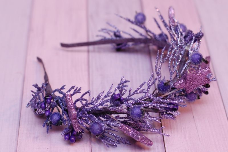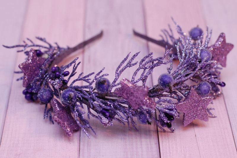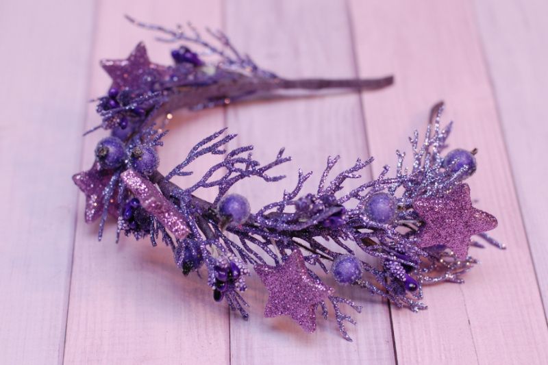 Ободок выполнен на металлической основе в сиренево-фиолетовом цвете. Декорирован веточками, ягодками и звездочками. Подойдет для красивых зимних фотосессий, на утренники под образ звездочки