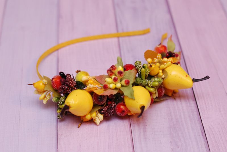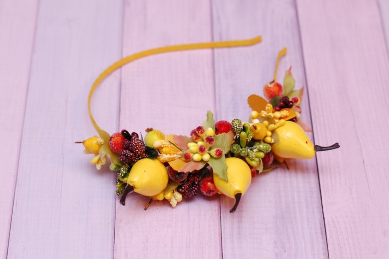 Шикарный обруч в осеннем стиле с ягодками, тычинками и грушками. Обруч подойдет к празднику осени в школах и садиках, для фотосессий.