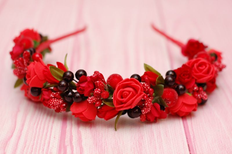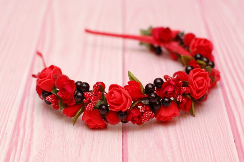 Обруч выполнен в черно-красных цветах. Подойдет под вышиванку с черно-красной вышивкой. Основание – металлическое, размер – универсальный.