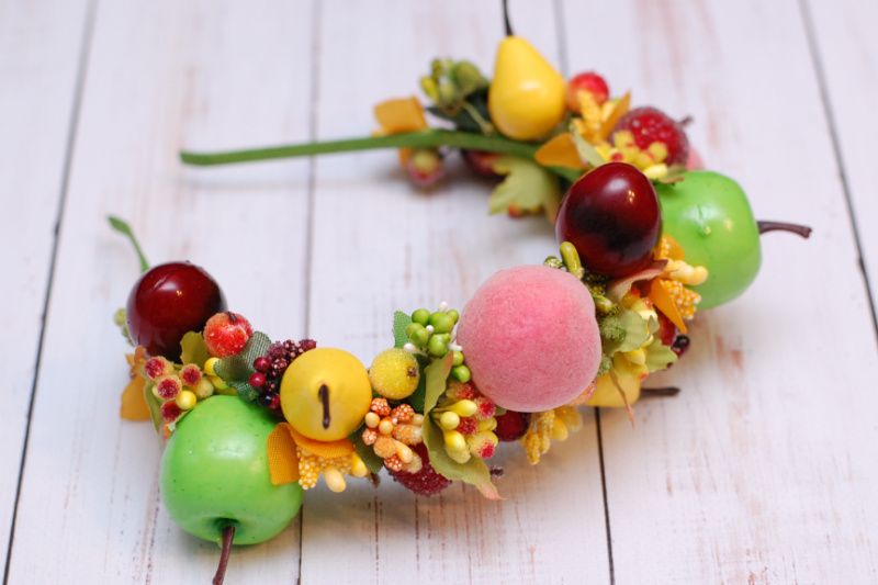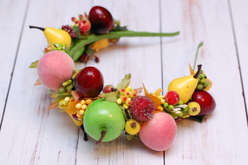 Шикарный обруч в осеннем стиле с яблоками, грушами, вишнями, персиками. Оруч полный, очень нарядный - подойдет к празднику осени в школах и садиках, для фотосессий и просто как очень стильное и красивое украшение для леди любого возраста!