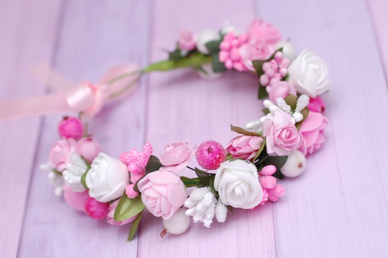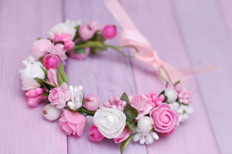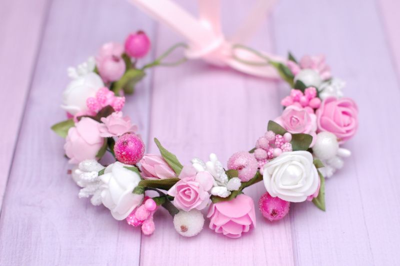Нежная объемная повязка на пучок выполнена в бело-розовых цветах. Подойдет для бублика диаметром 8 см. Под заказ можно другие цвета и другие размеры