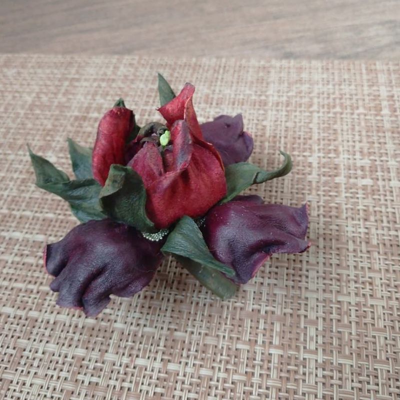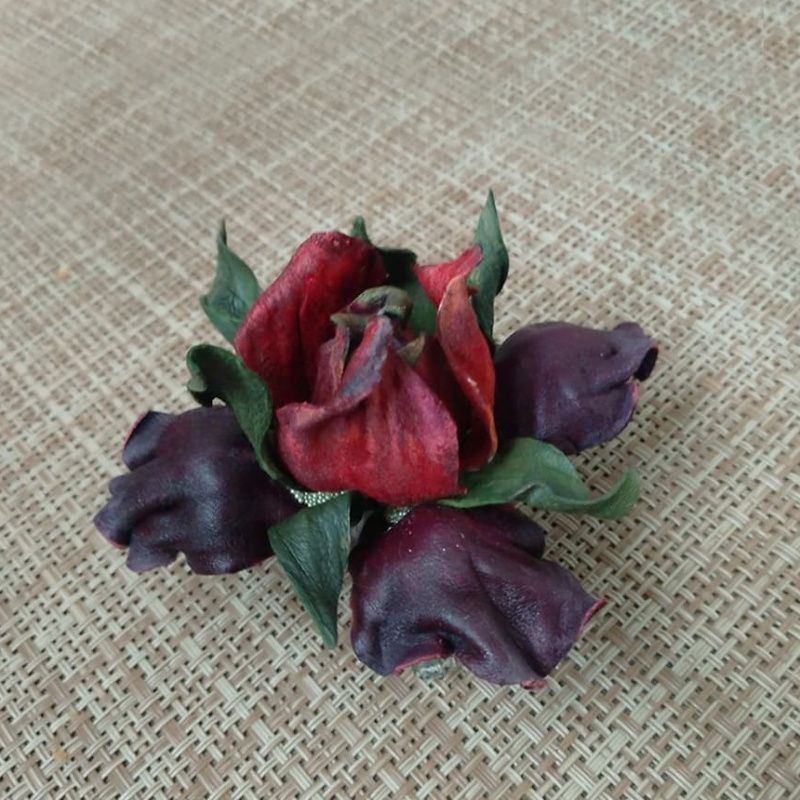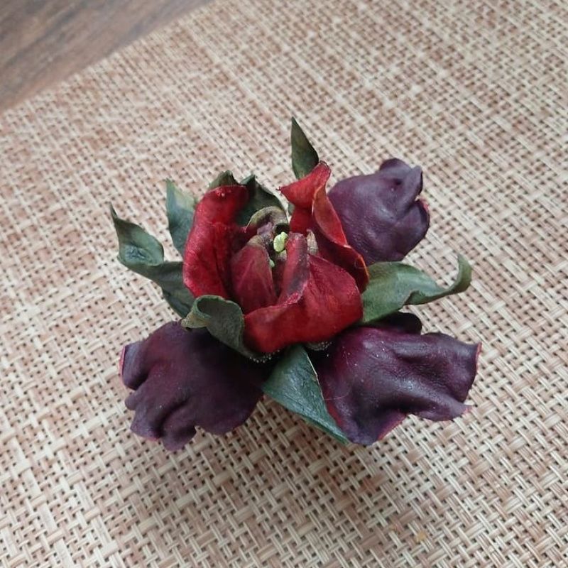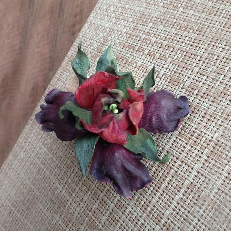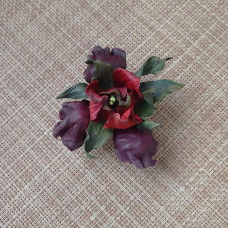 Ирис из кожи, брошь с подкраской лепестков. Размер в высоту- 8, 5 см, в ширину- 10, 5 см. Крепление - брошечная булавка.