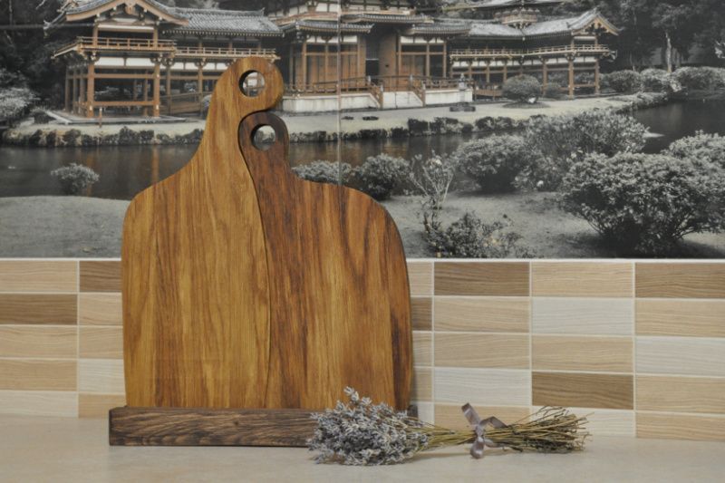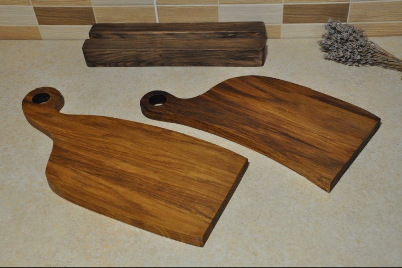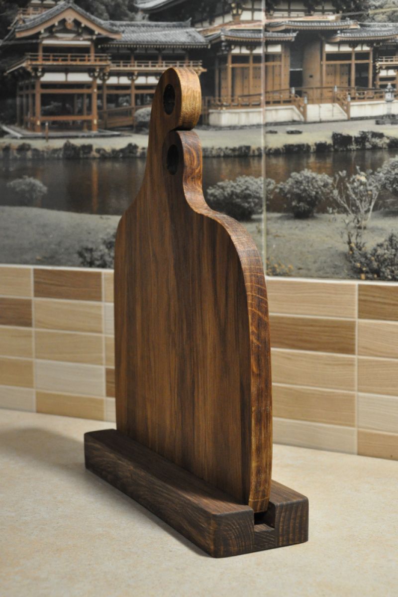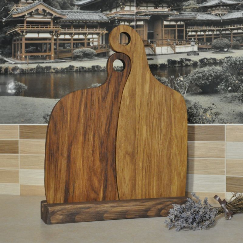 Разделочные доски необычной формы из массива дуба станут одновременно и украшением вашей кухни, и полезным инструментом для приготовления или подачи разнообразных блюд. Оригинальный набор досок на подставке может стать интересным и практичным подарком для ваших друзей или родных. Доски изготовлены вручную из тщательно подобранных материалов и обработаны льняным маслом, что защищает древесину от порчи и подчеркивает фактуру натурального дерева. Составленные в паре доски имеют общую ширину 27 см и высоту 34 см. Размеры рабочей поверхности большей доски: 14 см х 23 см. Размеры рабочей поверхности меньшей доски: 13 см х 21 см. Толщина досок 18 мм.